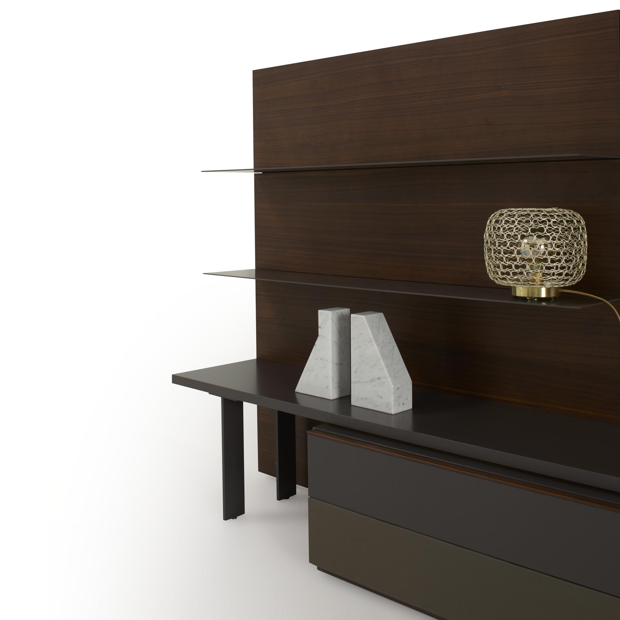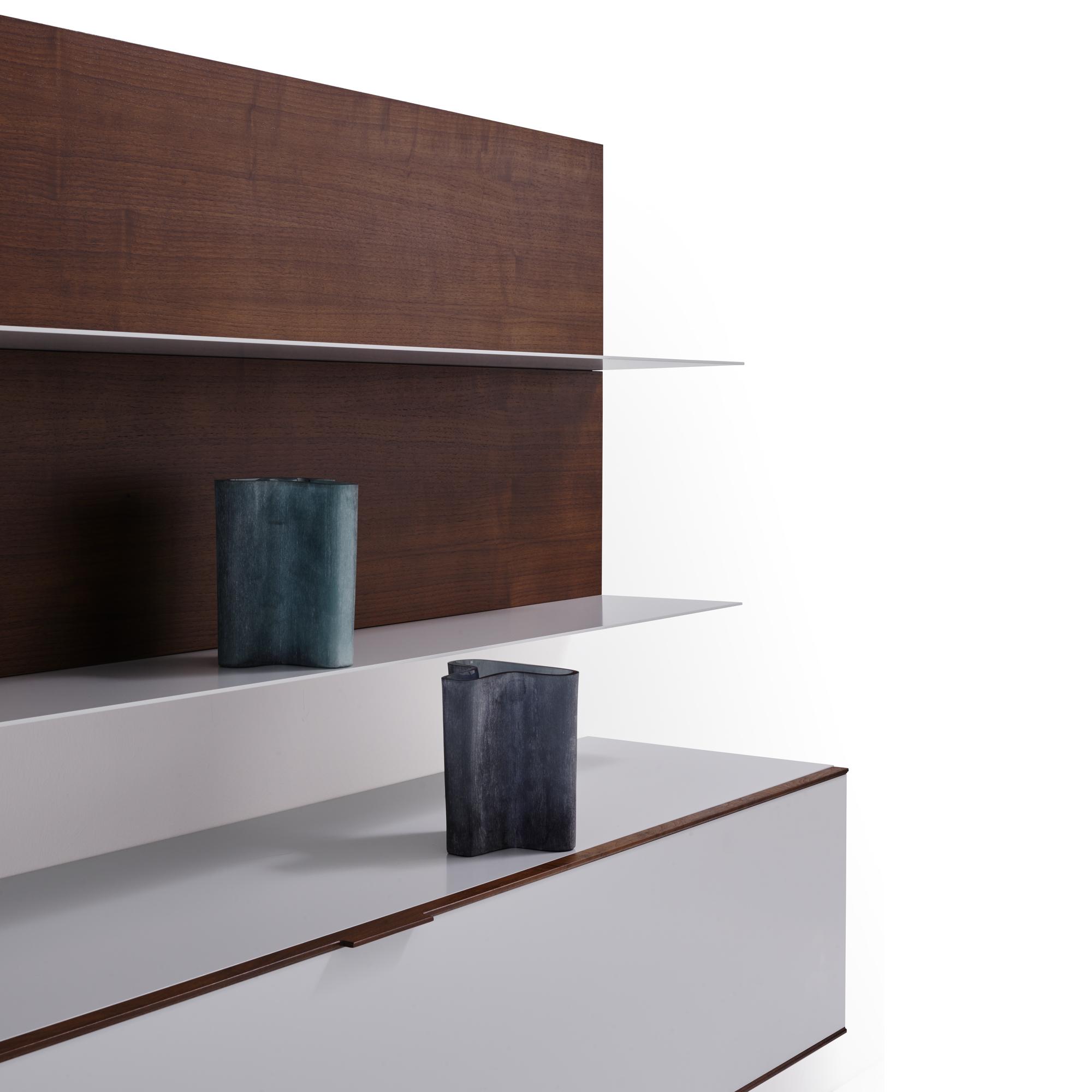 CONCEPT & DESCRIPTION : “Canaletto’s modular nature opens up new horizons in terms of containing, but also displaying, showcasing, demonstrating...Open or closed modules and staggered vertical separations confer remarkable graphic lightness reminiscent of the tableaux of the view painter Canaletto. The closed chests are given substantial and extremely significant character in the profiling, both horizontally and vertically, of the flap doors and drawers, thanks to the profiled uprights and projecting handles in ‘Canaletto walnut’. These finishes transform a furniture system into a jewel with a unique spirit which draws the attention to the manufacturing details and a refined appearance. With Canaletto, putting together a composition will no longer be a puzzle or a series of difficult choices between function and aesthetics. Canaletto is an essential expression of a tranquil design response to the practical demands of modern life.” Mauro Lipparini An elegant modular range combining lacquer with solid wood. Note the quality of finish as embodied by the dark walnut lip which serves as a handle for the doors. It responds perfectly to contemporary requirements of a modular system, offering solutions for hi-fi and storage, plus shelving and a sideboard. Items are created by juxtaposing elements. Once the structure is defined - H 50 (TV unit), H 75 (sideboard), H 145 or H 210 then W 67 or W 135 – it can then be completed in a number of ways. Shelving can be located in the lower section with a door above, or vice versa. One could also have full-height shelving, or even close the space completely. The end result of this is an undeniably original style with a powerful identity. The shelving can be equipped with 2 or 3 optional illuminated vertical separations (predefined) to provide refined, indirect LED lighting (LED ribbon, glued in place, with a reflector which slides along the vertical panel). The double doors have the unusual feature of having only one handle on the right-hand side. This touch of visual lightness is all part of the overall minimalism. The left-hand door may be opened via a finger-hold on the edge once the right-hand door has been opened. Wooden elements incorporating slim aluminium shelves may be used to dress a wall. If these are extended towards the floor by an additional wall panel, a complete wall panel is created. A choice of 3 widths is on offer. These wooden elements may be complemented with illuminated LED strips which are located towards the top and across the width of these wooden elements. With his sense of proportion, and with the rhythm and looks he has brought to it, Lipparini’s new modular range is both luxurious and high-end. Thanks to its simplicity, it is immediately comprehensible. The lacquer colours have been selected with care : elements may be plain, in either plomb or perle lacquer, or these two lacquer colours may be combined with dark walnut veneer. Argile lacquer is always used in combination with dark walnut and interiors of chests in argile lacquer are always in plomb lacquer. The doors come with a vertical solid walnut lip to both left and right. The shelves are perforated on the sides. The subtle nature of the indirect LED lighting, and the addition of a glazed element (green- coloured, H-shaped) in the shelving unit reinforces the understated elegance of the alliance of materials. Probably one of the best-finished ranges in our collections, this is a real work of cabinet-made art.