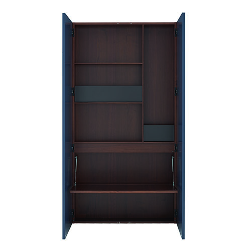 柜子:內部(底部、內壁、隔板、柜門內部、翻蓋)完全采用深色胡桃木貼面。 柜門:柜門有兩種款式: – 正面采用Steelcut Trio面料進行裝飾,內側采用胡桃木貼面。關門側的邊緣為單板,其他3個側面為黑色陽極氧 化鋁型材。 – 完全上漆,可選擇顏色(16種顏色)。