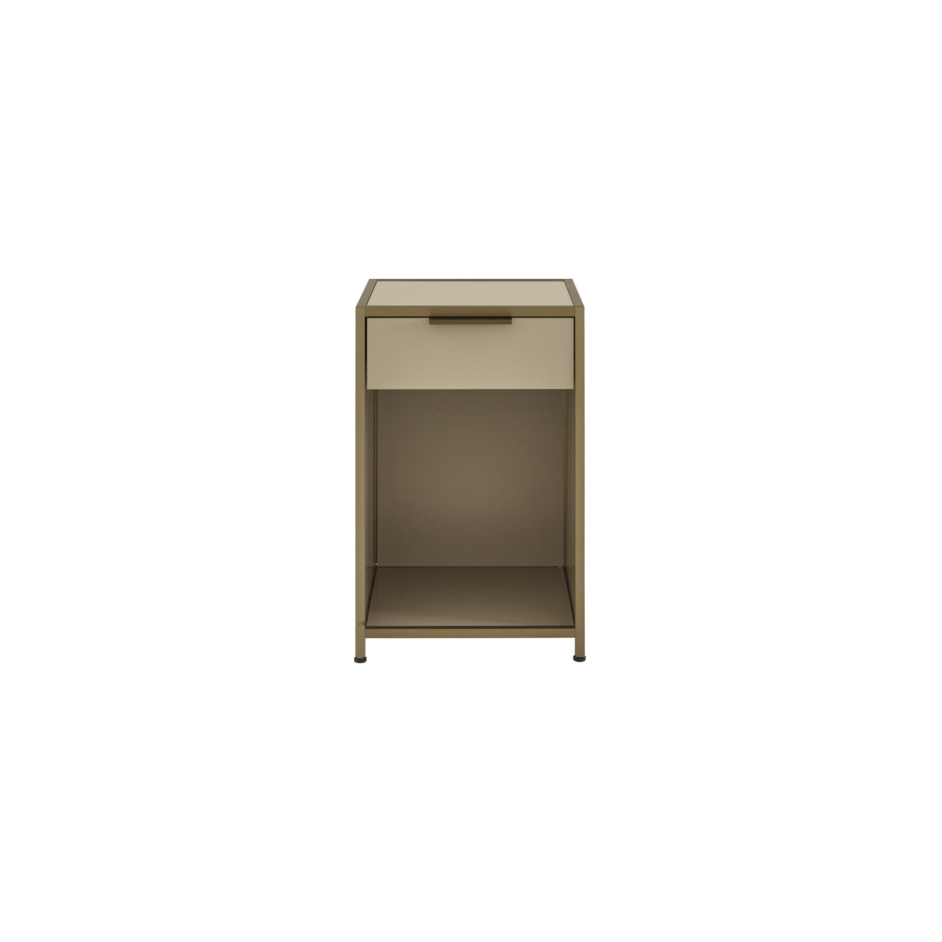 CONCEPTION : although it might be evocative of certain metal modular systems from the office world, Dita clearly distances itself from these in a number of ways: its lacquered panels are in wood rather than sheet metal; its discreet profiled uprights with their sophisticated finish are perfectly placed, cast and not part of the structure; a matching handle which is light and beautifully designed; and its small, slim feet which continue the line of the structure in a very natural way. QUALITY OF MANUFACTURE & FINISHES: uprights are in 15 x 15 mm anodised aluminium section in a brushed bronze finish. These frame the wooden panels which are finished in argile lacquer on the interior faces and in a choice of 16 colours for all visible exterior faces: - satin white, argile and perle (standard), - brique, bleu lavande, chocolat, moutarde, elephant, ranger, noir, bleu nuit, brun acajou, bleu gentiane, cuivre, gris platine (to order). All items are single-sided but are finished on the back (back panels and edges in argile lacquer). Certain items may be given an optional double- sided treatment, with the addition of a rear finishing panel. Handles are in injected zamak, lacquered bronze to co-ordinate with the uprights. Hinges are black. The feet H 30 mm continue the line of the uprights and incorporate a black jack. The new shelving unit, at H 189 cm the same height as the storage column, has shelves in a choice of 17 finishes: grey smoked glass, satin white/argile/perle lacquer, plus the 13 'to-order' lacquer colours (brique, bleu lavande, chocolat, moutarde, elephant, ranger, noir, bleu nuit, brun acajou, bleu gentiane, cuivre, gris platine). The 4-drawer chest is composed of 3 identical drawers topped with a narrower upper drawer. The 6-drawer chest is composed of 5 identical drawers topped with a nattower upper drawer. The bench/TV unit is available in 2 versions, either with a cushion or with a lacquered top. It comprises 2 flap doors with 2 lower glass shelves (could be used as hallway storage). The cushion in high resilience polyurethane Bultex foam 53 kg/m3 – 6.3 kPa is covered in Steelcut trio 3 (choice of 53 colours).