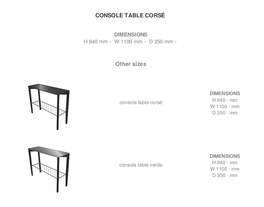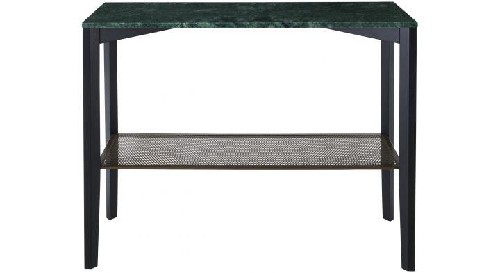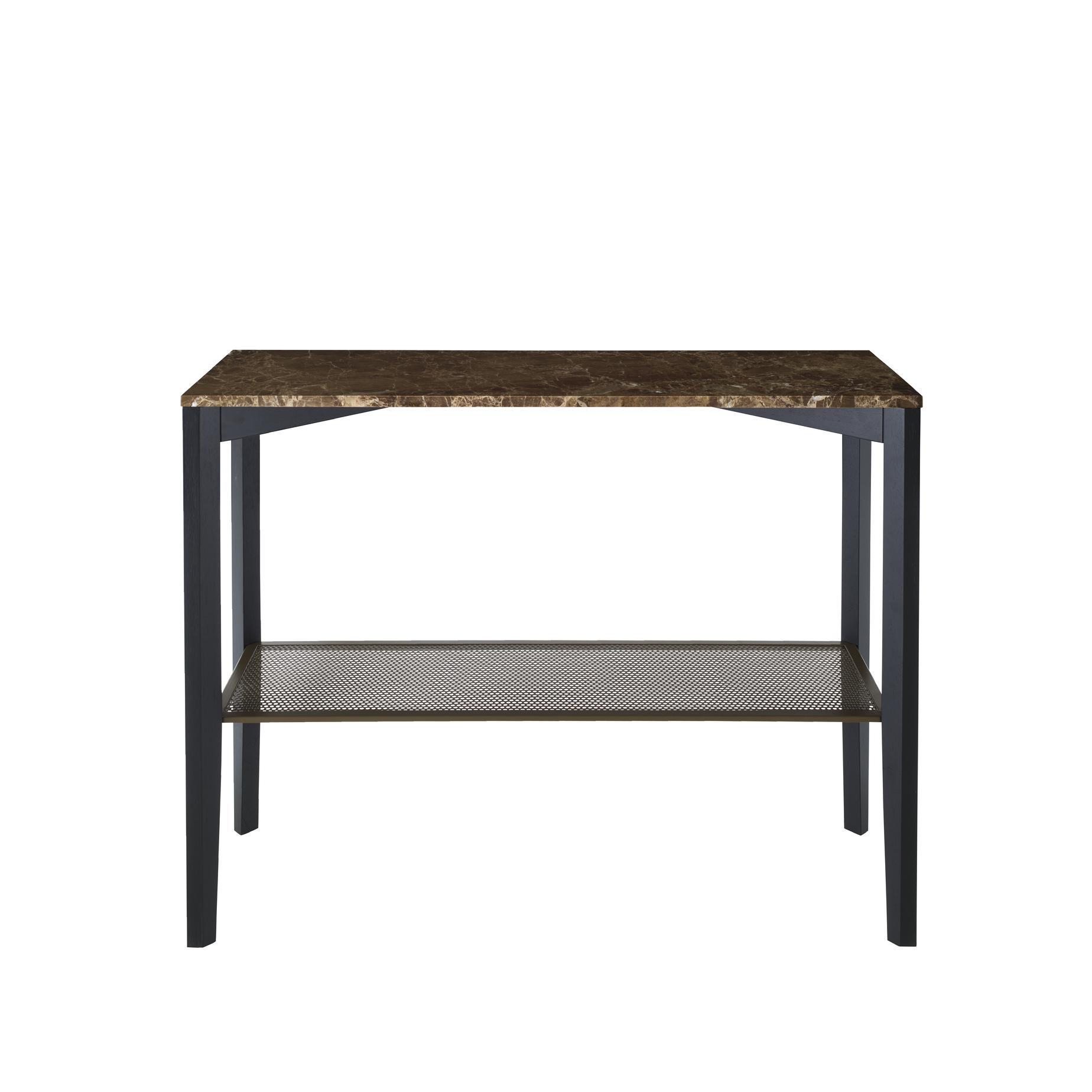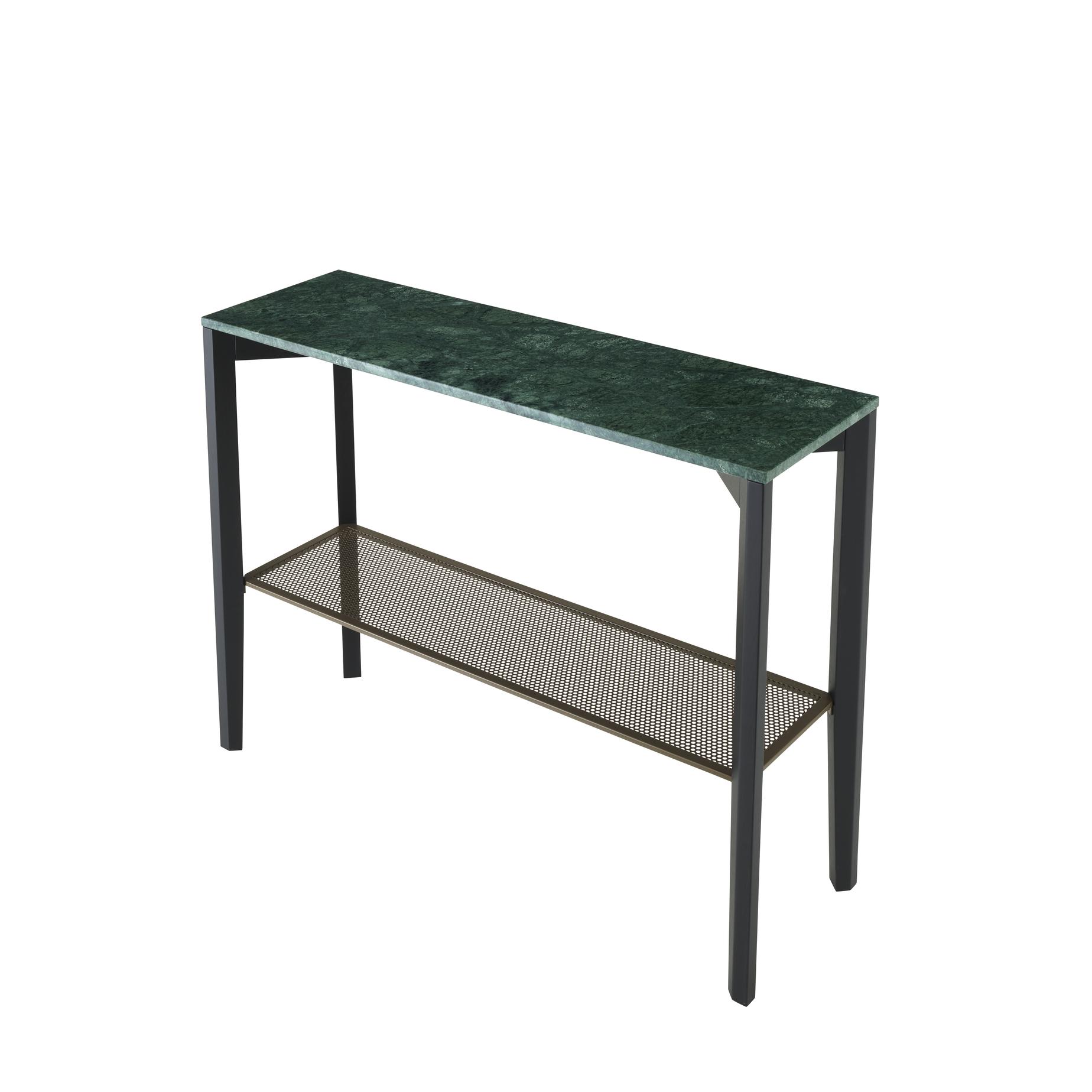 Twin-deck console table. Structure and bevelled base in black-stained solid ash. Lower top in bronze lacquered sheet steel with round perforations and a plain border. Upper top in verde or corsé marble in a brilliant-polished finish with anti-stain treatment and softened edges.