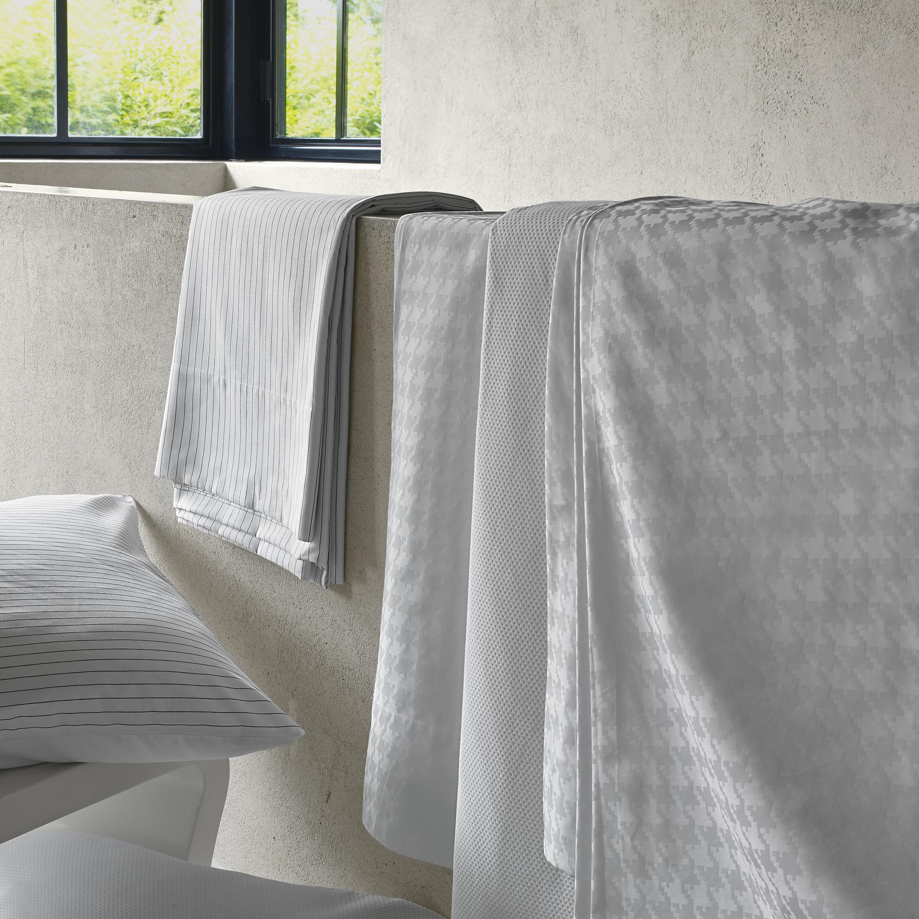 Bedding in white 100 % cotton (130 g/m2). The visible faces of the pillowcases (without flounces( and duvet covers (zip closure) are in 'Pied de coq' fabric; the backs are in white 'Tonalité' fabric (100 % satin cotton - 115 g/m2). The top sheet has a 12 cm hem. Machine washable at 60°. May be bleached using chlorine-based products. Line (drip) dry; do not spin. Medium iron. Dry clean (perchlorethylene).