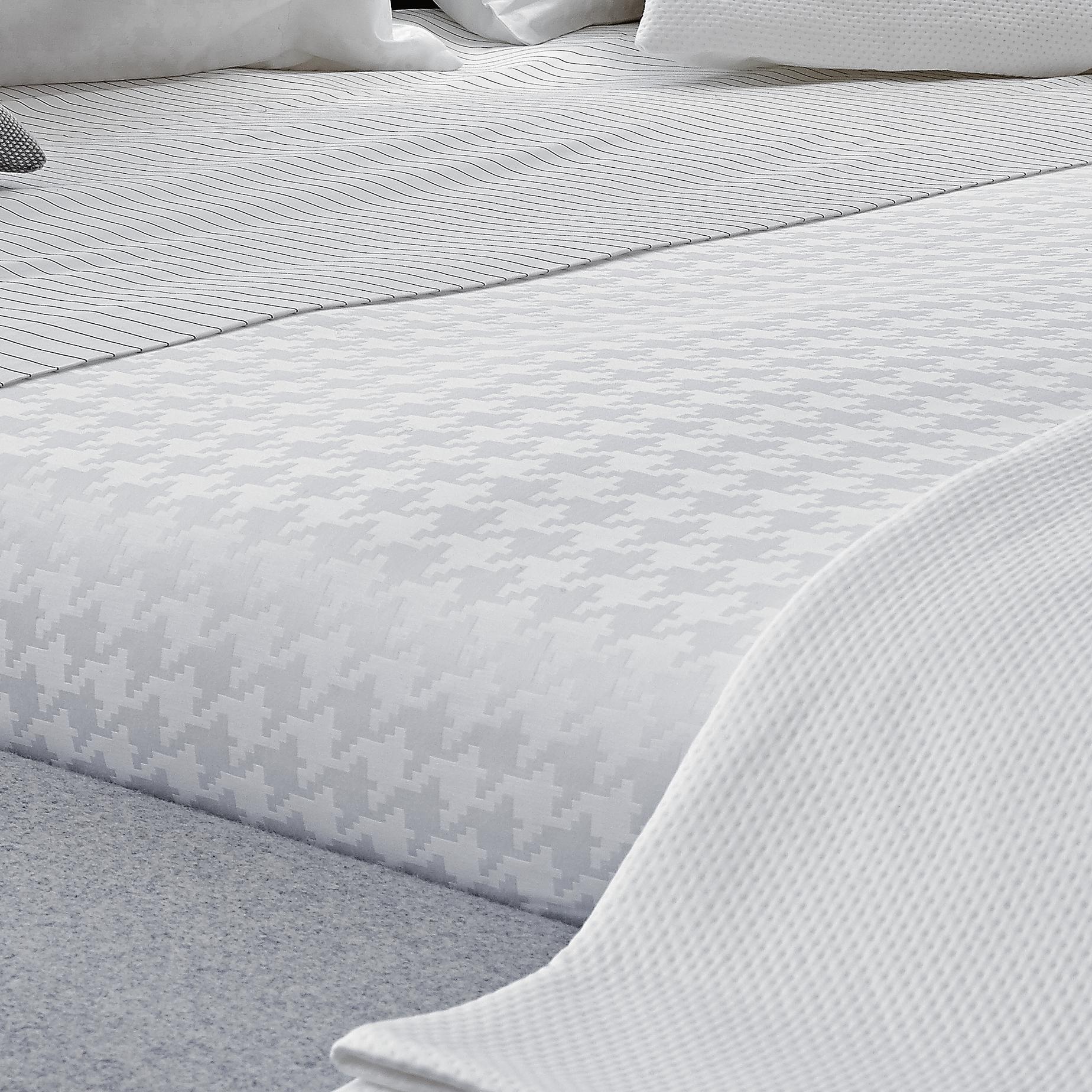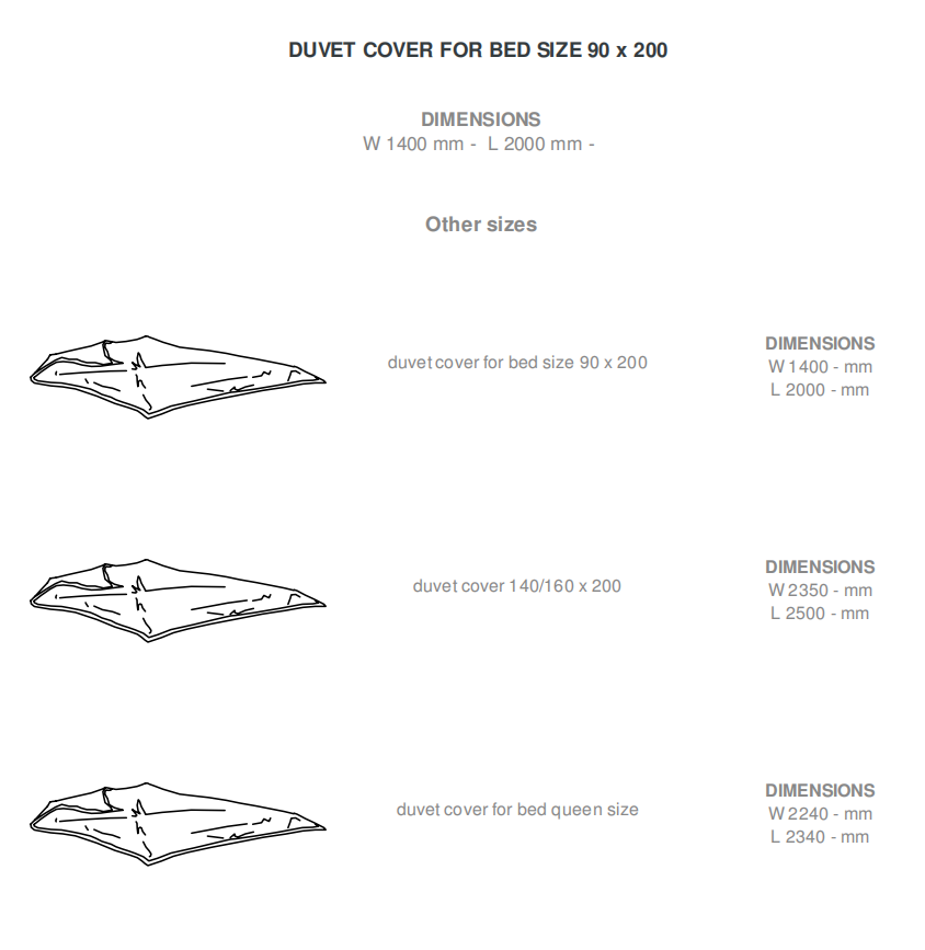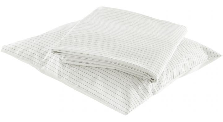 Bedding in 100% white cotton (130 g/m2). The visible faces of the pillowcases (without flounces) and duvet covers (zip closure) are in 'Rayé' (black-striped) fabric; the backs are in white 'Tonalité' fabric (100 % satin cotton - 115 g/m2). The top sheet has a 12 cm hem. Machine washable at 40°. Do not bleach. Line (drip) dry; do not spin. Medium iron. Dry clean (perchlorethylene).