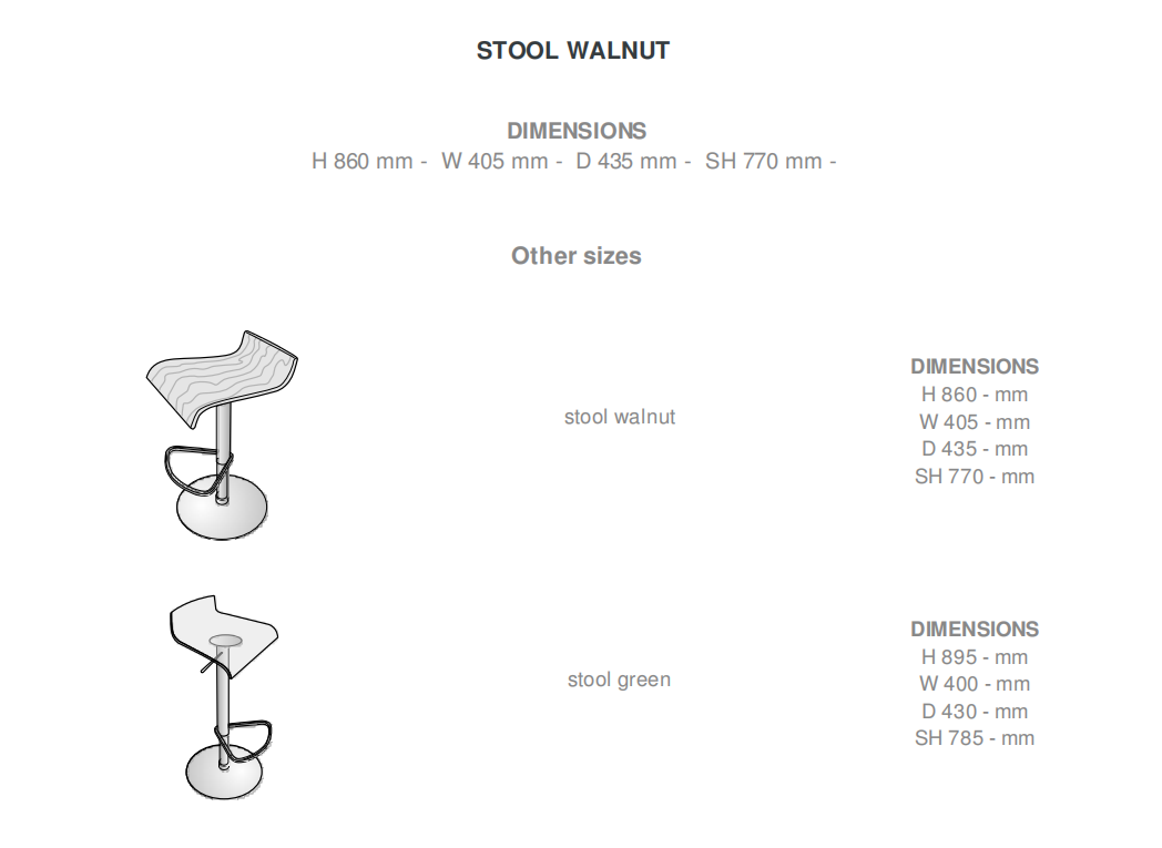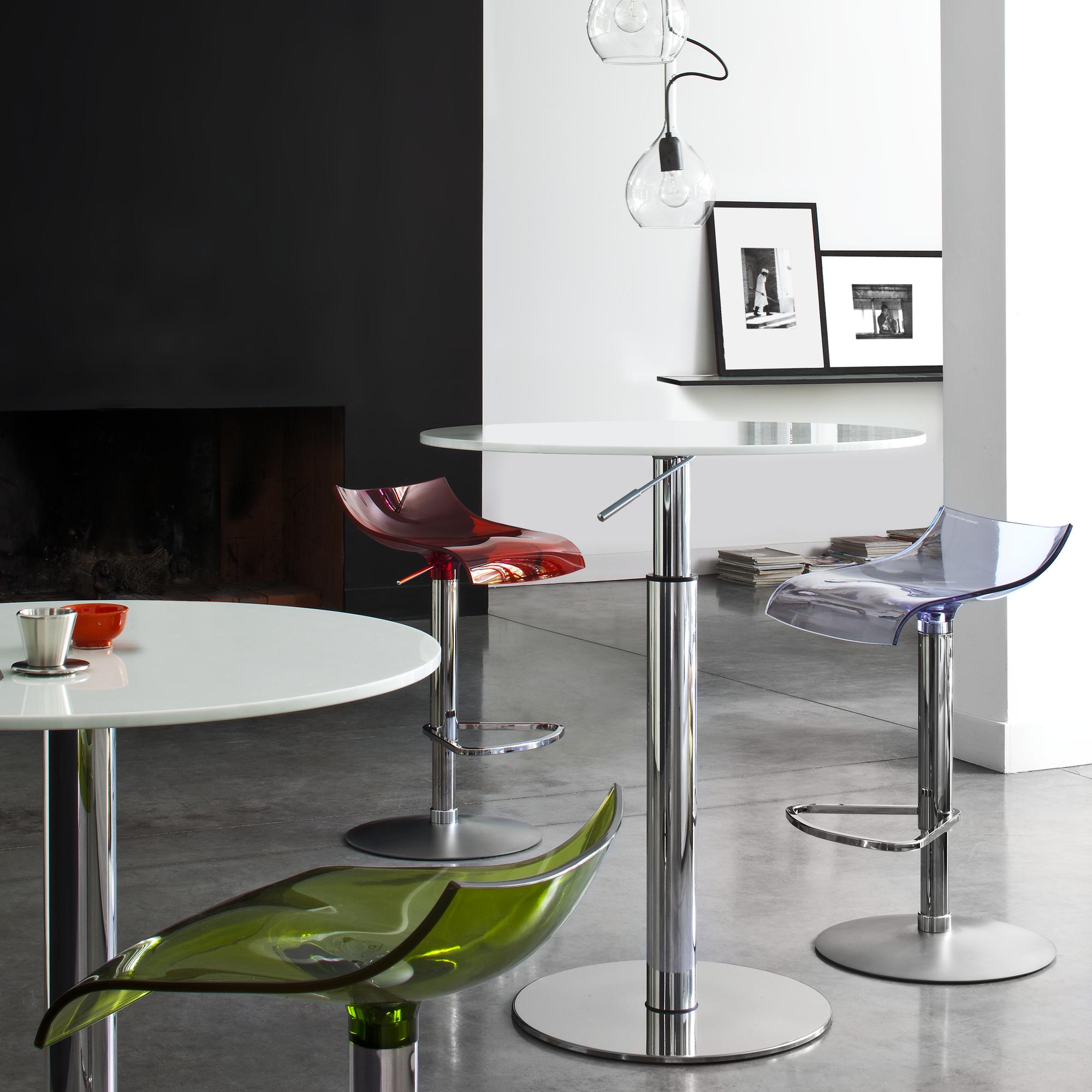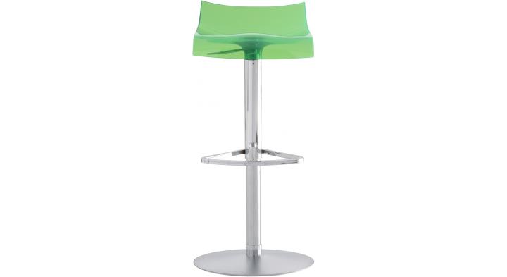 Bar-stool, adjustable via a gas piston, with seat in veneered beech multi-ply, in translucent PMMA or in beech multi-ply covered in synderme hide. Frame in matt chromed metal.