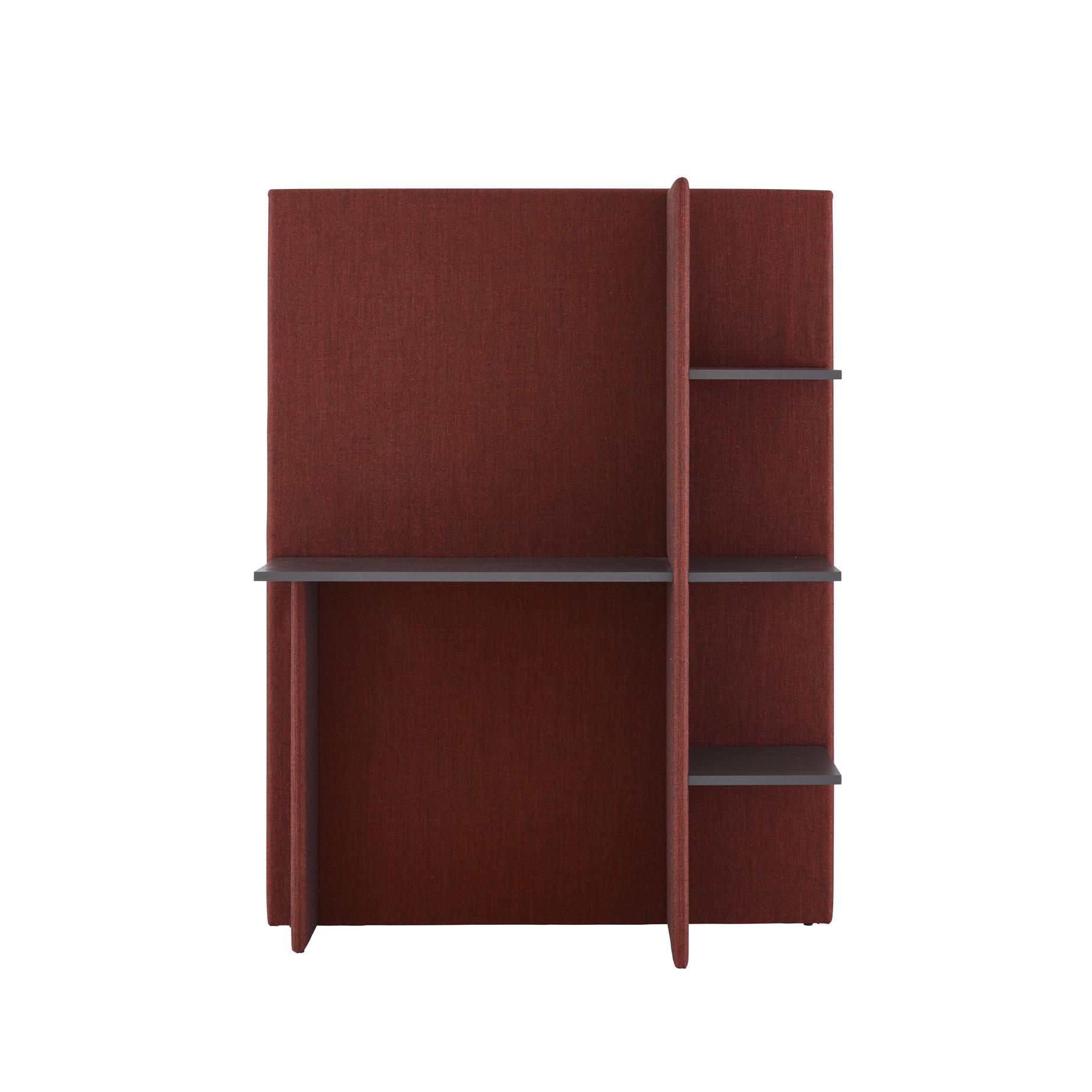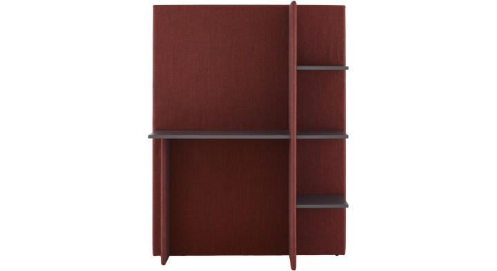 Softwall is a multifunctional screen. A multifaceted workstation, it enables one to setup and work in the corner of numerous spaces such as a living room or bedroom. The foam- clad, fabric-covered vertical panel provides both visual intimacy and sound insulation. The bookshelves and small work surface enable one to use a laptop or tablet in peace and quiet. The neutral finish of the anthracite-stained ash veneered shelves and the wide choice of 45 colours for the fabric covering enable one to integrate the Softwall screen into any existing decorative scheme. Finally, Softwall is an original and sympathetic piece thanks to the warm materials of which it is made : woollen fabric and wood veneered shelves.