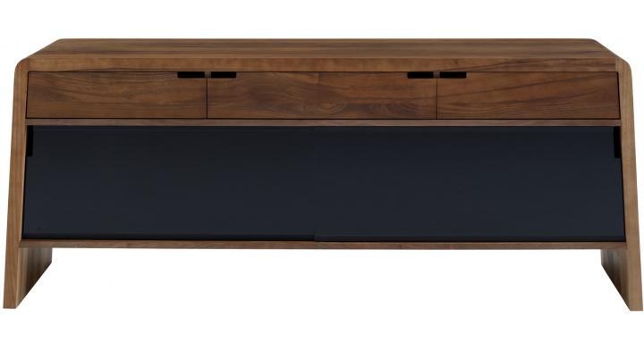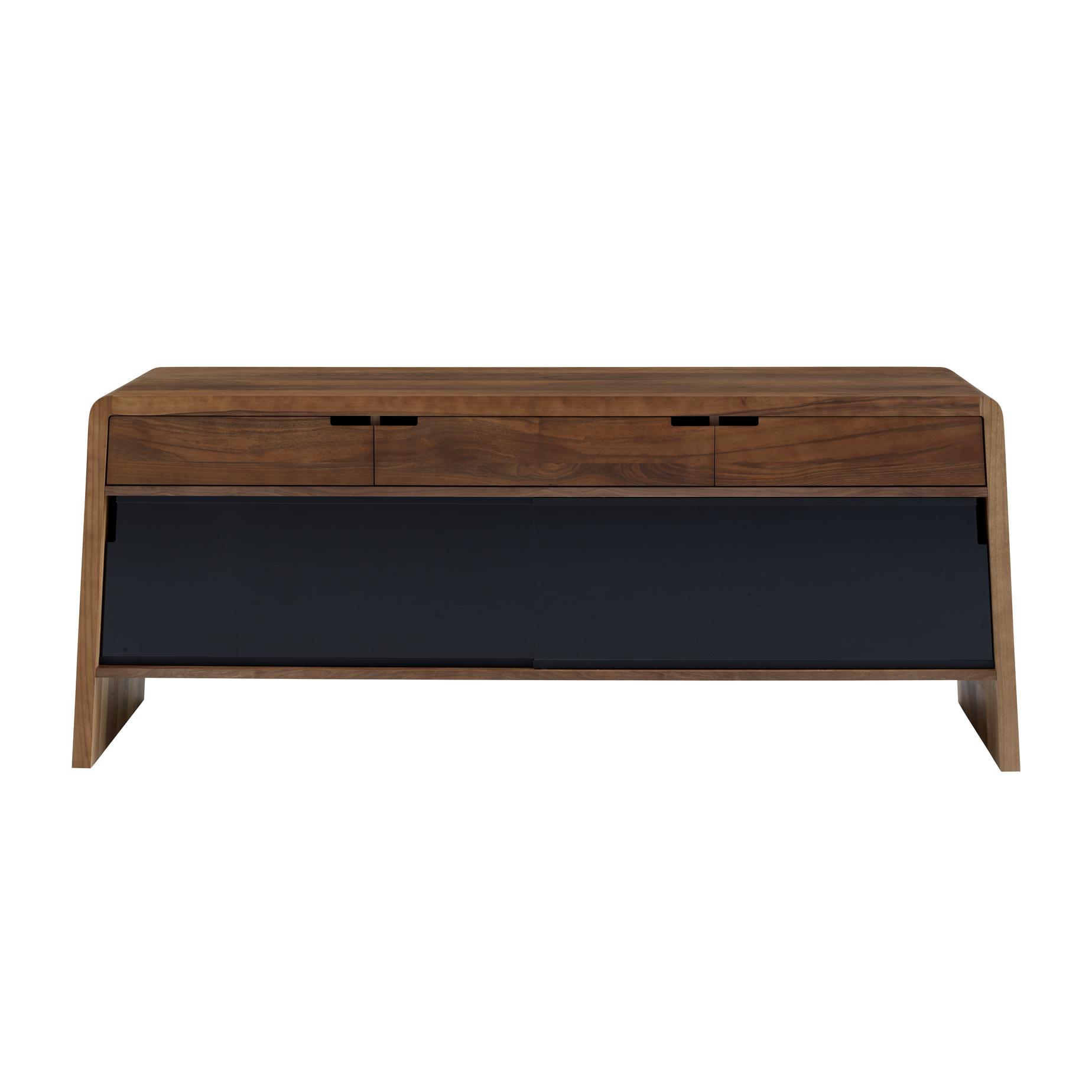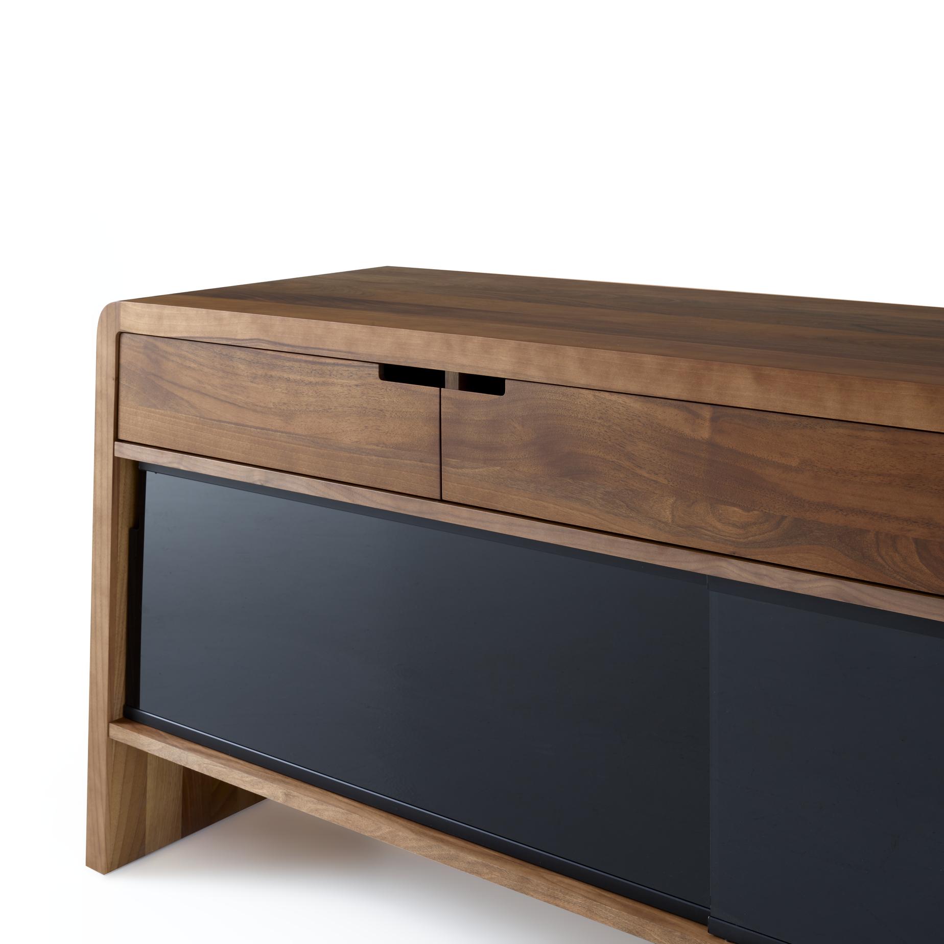 Sideboard with structure in natural varnished solid American walnut. 2 sliding doors in black mass tinted toughened glass and 3 walnut drawers mounted on invisible runners and equipped with controlled closing. This sideboard has 2 adjustable jacks to the rear and 2 nylon gliders at the front.