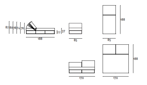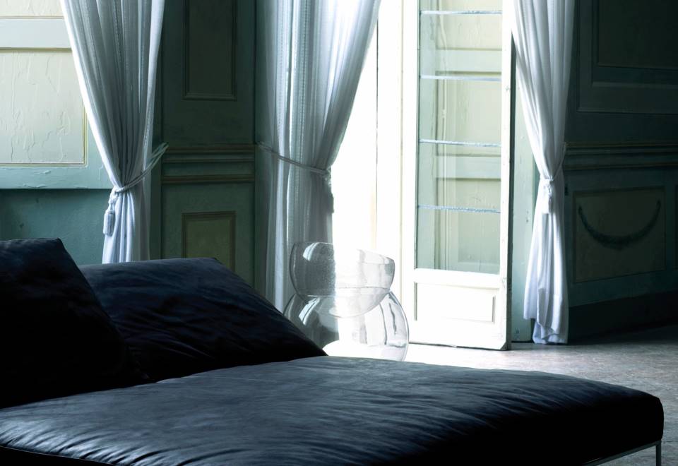Daybed, single or double, available for indoor and outdoor. Indoor: seat chassis in lacquered steel with coated rubber  elastic straps. Backrest in plywood panel adjustable through a  mechanism. Seat and back cushions padded with differentiated  density polyurethane foam and Visco-soft “Xtra-pur”, covered  with a quilted mat in prewashed and sterilized goose down,  stitched into separate compartments, or covered with acrylic  fibre layers. AISI 304 stainless steel square section tube base,  matt satin-finished. Fabric or leather upholstery, both fully  removable by zippers and Velcro fastenings.  Outdoor: seat chassis with cataphoresis treatment and  lacquered for outdoor, coated rubber elastic straps, hooks in  stainless steel for outdoor. Backrest in marine plywood panel  adjustable through a mechanism. Seat and back cushions  padded with open cell structure polyurethane foam DRYFEEL S,  covered with a waterproof fabric. AISI 316 stainless steel square  section tube base, matt satin-finish. Standard with wheels only  in the single version 188x85cm. Upholstery with outdoor fabrics  only, fully removable by zippers and Velcro fastenings. Both versions have a mechanism inserted into the backrest  frame, adjustable in 5 different positions from daybed up to  a height of 82cm. Seat depth 124cm.