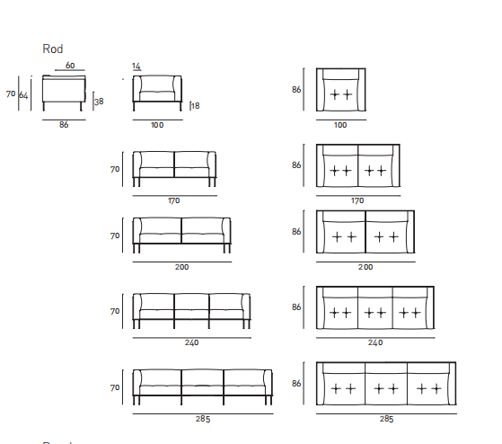 Sofa, armchair and bench. Supporting structure in lacquered  drawn tubular steel, seat sprung with coated rubber elastic  straps and polyurethane foam. Backrest and armrest structure  in self-supporting decorative HPL panel. Covering in 100%  polyether, thermally bonded onto a polyamide velveteen backing.  Backrest and seat cushions in prewashed and sterilized goose  down, with polyurethane foam insert. The seat cushions are  quilted with buttons at sight or, on request, quilted without  buttons. Armrest cushions in polyurethane foam covered  with prewashed and sterilized goose down, with a poplar  plywood supporting panel fixed to the frame by plug-in hinges.  Stainless steel feet, polished or matt satin-finish, screwed to  the base with a bushing. Fabric or leather upholstery, both fully  removable by zippers and Velcro fastenings.  Seat depth 60-80cm.  Rod and Rod XL have undergone and passed the Tests:  seat and back static load and fatigue, front and side legs  static load, and drop test (EN 1728:2000), with issue of relative  certificate by CATAS?.