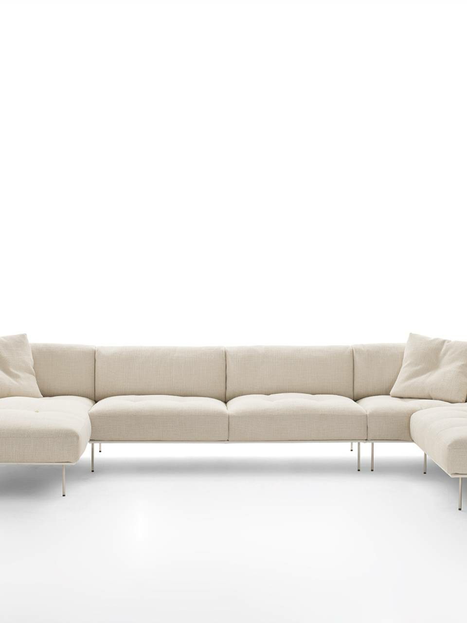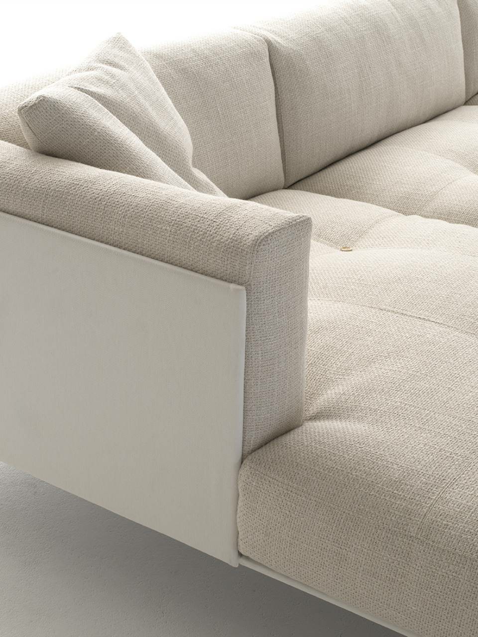 Supporting structure in lacquered drawn tubular steel, seat sprung with coated rubber elastic straps and polyurethane foam. Backrest and armrest structure in self-supporting decorative HPL panel. Covering in 100% polyether, thermally bonded onto a polyamide velveteen backing. Backrest and seat cushions in prewashed and sterilized goose down, with polyurethane foam insert. The seat cushions are quilted with buttons at sight or, on request, quilted without buttons. Armrest cushions in polyurethane foam covered with prewashed and sterilized goose down, with a poplar plywood supporting panel fixed to the frame by plug-in hinges. Stainless steel feet, polished or matt satin-finish, screwed to the base with a bushing. Fabric or leather upholstery, both fully removable by zippers and Velcro fastenings.