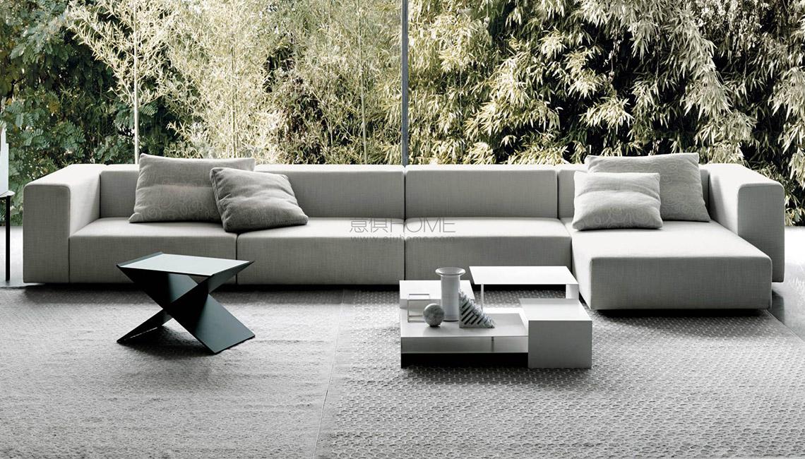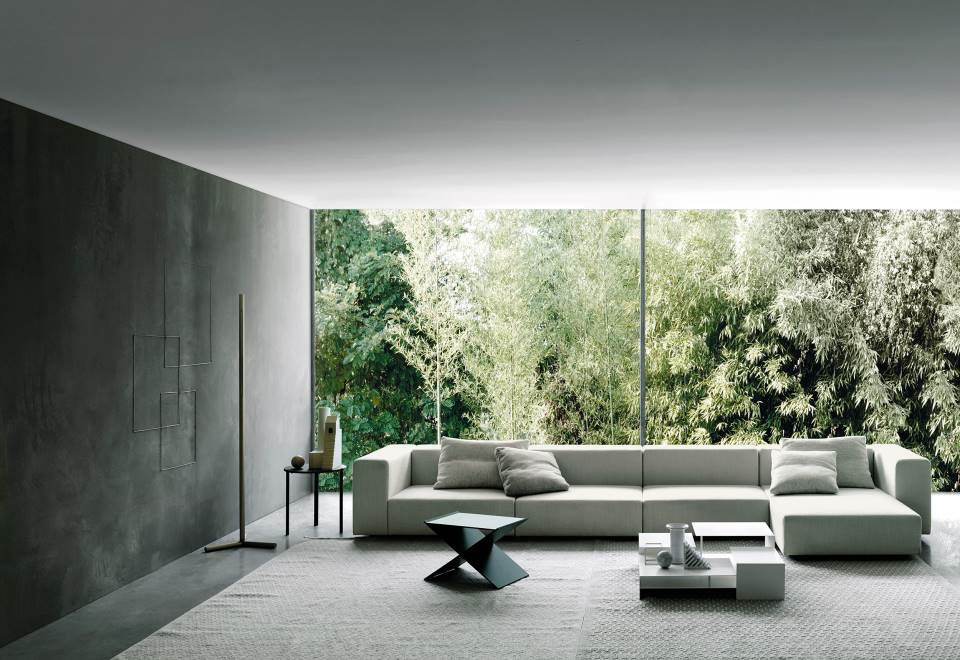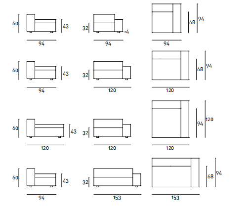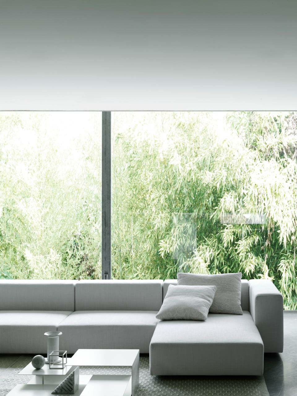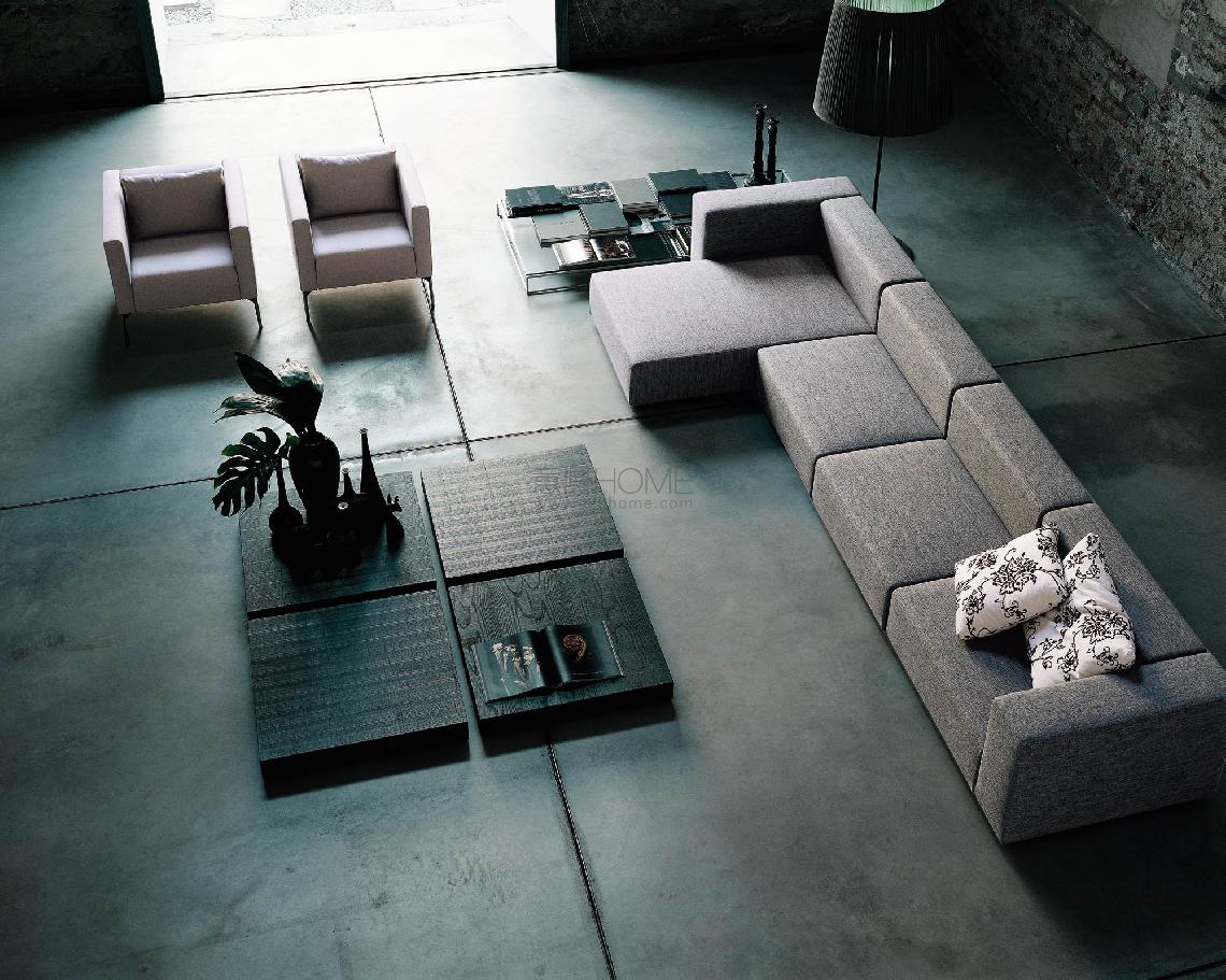 Modular elements of different sizes with frame in double-panelled poplar and pine. Support in cross-woven, coated rubber elastic straps. Padding in differentiated density polyurethane foam. Covering in needle punched, resinated, nonwoven polyester fibre, bonded onto a polyamide velveteen backing. Black adjustable PVC feet (Wall) or base in AISI 304 stainless steel with matt satin-finish (Wall2). Fabric or leather upholstery. The fabric version only is fully removable by Velcro fastenings. The various elements are joined together by means of hooks. Seat depth 68-94cm.