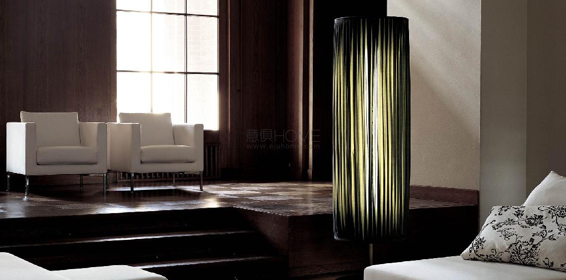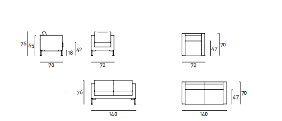 Fix or modular sofa and armchair with one-piece frame  in double-paneled poplar and pine. Support in cross-woven,  coated rubber elastic straps. Shell padding in differentiated  density polyurethane foam. Covering in needle punched,  resinated, non-woven polyester fibre, bonded onto a polyamide  velveteen backing. Seat and back cushions in prewashed and  sterilized goose down, stitched into separate compartments,  or with preformed structure in differentiated density polyurethane  foam, coated with acrylic fibre layers. Chromed steel feet or,  on request, with satin nickel finish joined by a bracket.  Fabric or leather upholstery.  The fabric version only is available with flounce 9cm from  the floor and is fully removable by zippers and Velcro fastenings.  The leather version is always without flounce and non-removable  upholstery.  Seat depth 47-57cm.