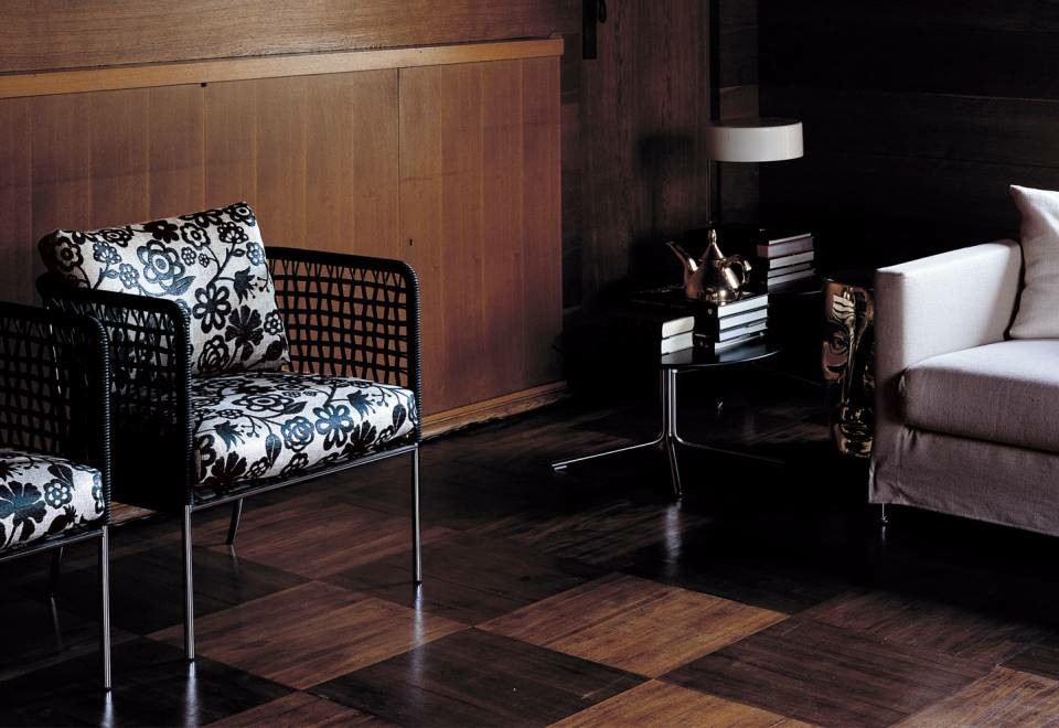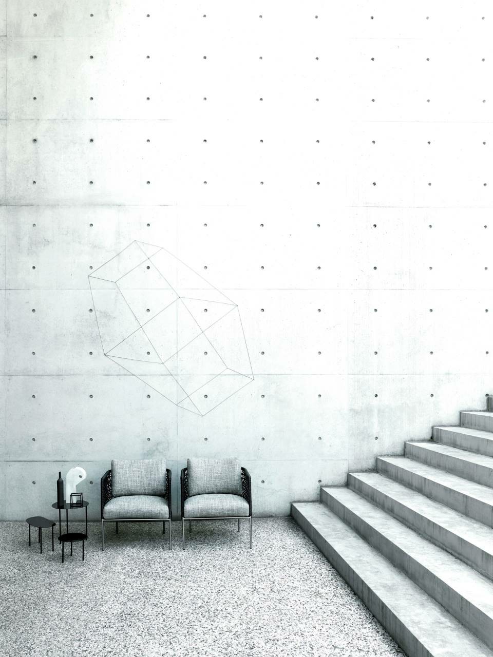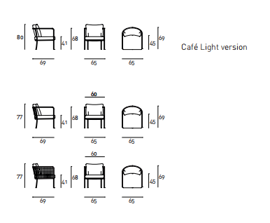 Small armchair available for indoor and outdoor. Indoor: tubular steel frame with chrome finish or AISI 316 stainless steel with matt satin-finish. Seat chassis in lacquered steel with padding in differentiated density polyurethane foam, for chromed version; self-supporting decorative HPL plastic laminate panel for AISI 316 stainless steel version. Fabric or leather upholstery, both fully removable by zippers, after unscrewing the seat chassis from the frame (chrome version). Woven with coach-hide, hempen rope or PVC profile in the colours of our collection. Seat cushion with preformed, differentiated density polyurethane foam structure, coated with acrylic fibre layers, backrest cushion in prewashed and sterilized goose down, stitched into separate compartments; in the Cafè Light version, backrest cushion always in differentiated density polyurethane foam structure, coated with acrylic fibre layers. Outdoor: frame in AISI 316 stainless steel with matt satin-finish. Seat in self-supporting decorative HPL plastic laminate panel. Woven with PVC profile, in the colours of our collection. Seat and back cushions padded with open cell structure polyurethane foam FILTREN?T covered with fibre for outdoor and upholstery with outdoor fabrics only, fully removable by zippers. Seat depth 45cm.