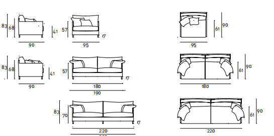 Fix or modular sofa and armchair. Supporting frame in lacquered  drawn tubular steel. Seat chassis in fir wood, with cross-woven,  coated rubber elastic straps. Backrest and armrest frames  made with a structural elastic material. Covering in 100%  polyether thermally bonded onto a polyamide velveteen backing.  Seat and backrest cushions padding with polyurethane foam insert  coated with prewashed and sterilized goose down, stitched into  separate compartments, or covered with acrylic fibre layers.  Armrest cushions and supporting pillows in prewashed and  sterilized goose down, stitched into separate compartments.  Tubular feet in AISI 304 stainless steel with matt satin-finish,  on request available in natural or ebony-dyed oak. Fabric or leather  upholstery, both fully removable by zippers and Velcro fastenings.  Standard flounce 7cm from the floor for fabric upholstery only,  on request available also without flounce.  The leather version is always without flounce. Seat depth 61-81cm.