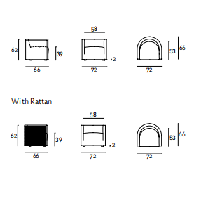 Supporting frame in preformed curved wood and padding in  differentiated density polyurethane foam; outer shell also  available covered in Rattan with acrylic painting finish col.  natural, dark brown “Testa di Moro”, or anthracite grey. Seat  sprung in cross-woven, coated rubber elastic straps. Covering  in needle punched, resinated, non-woven polyester fiber,  bonded onto a polyamide velveteen backing and 100%  polyether thermally bonded onto a polyamide velveteen  backing. Fabric or leather upholstery. The fabric version only is fully  removable by Velcro fastenings. Non removable upholstery for the version with outer shell  covered in Rattan. Black PVC feet or , on request, higher feet or wheels, with 2%  increase on listed price. Available also with swivelling base. Seat depth 53 cm.