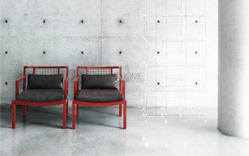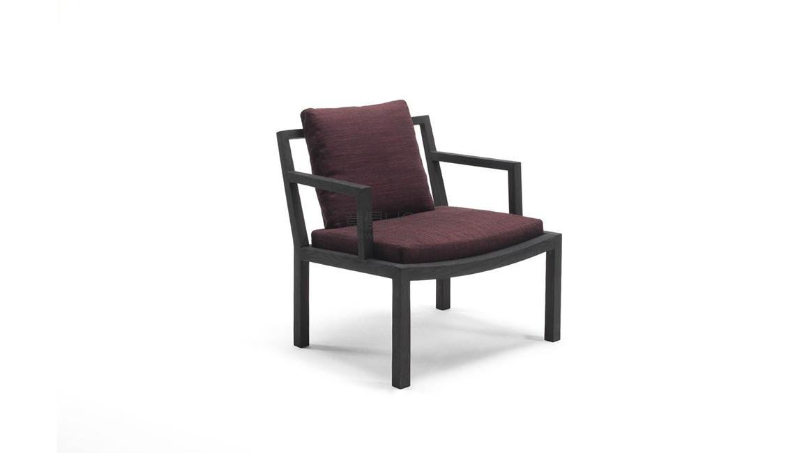 Small armchair with supporting frame in solid oak wood with acrylic painting finish, natural or charcoal dyed, or manual finishing in the color RAL K-7 3003 ruby red only. Backrest in multilayer, veneered and edged with oak plates, or weaved in hide, hempen rope, leather Scooby (braided leather trim) or profile in PVC, in the colours available in the collection. Seat chassis in lacquered steel, sprung with coated rubber elastic straps inserted into the seat cushion in differentiated density polyurethane foam, covered with a quilted mat in prewashed and sterilized goose down, stitched into separate compartments. Loose back cushion or lower back cushion in prewashed and sterilized goose down. Fabric or leather upholstery, both fully removable by zippers. Seat depth 53 - 42cm.