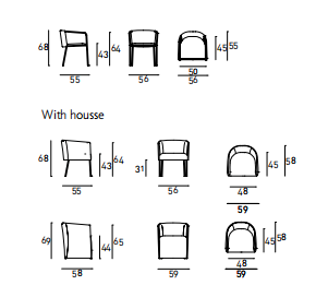 Armchair available for indoor and outdoor. Indoor: tubular steel frame, with black epoxy powder coating, (version without housse and with housse) or gunmetal color  (version with short housse). Seat chassis in poplar plywood with  cross-woven coated rubber elastic straps.  Seat and backrest padded with insert in polyurethane foam.  Covering in 100% polyether thermally bonded onto a polyamide  velveteen backing, fixed through Velcro fastenings to the seat  chassis in the versions with housse. Upholstery zipped to the  polyether covering for the version with housse only and fully  removable by zippers and Velcro fastenings. For the version  without housse, upholstery fully removable by zippers after  unscrewing the seat chassis from the frame.  Upholstery in leather (version without housse only) or fabric. Outdoor: available only for version without housse.  Frame in tubular AISI 316 stainless steel matt satin-finish.  Seat panel in marine plywood with cross-woven coated  rubber elastic straps. Seat and backrest padded with open cell  structure polyurethane foam FILTREN?T. Upholstery with outdoor fabrics only, fully removable by zippers after unscrewing the seat panel from the frame. Seat depth 45cm.