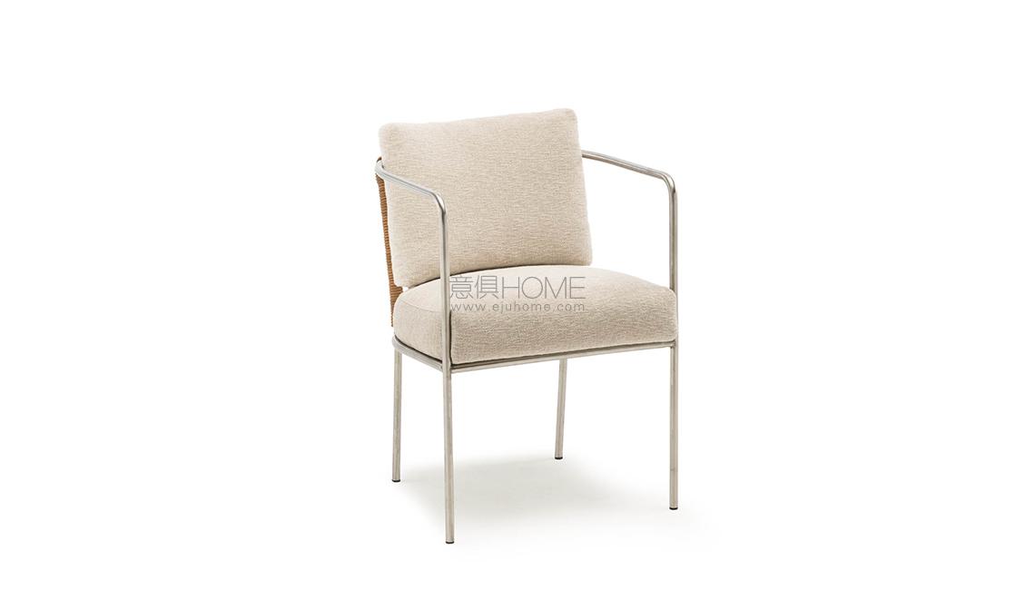 Armchair available for indoor and outdoor. Indoor version: tubular steel frame with chromed finish or in AISI 316 stainless steel with matt satin- finish. Seat panel in tubular steel with epoxy powder coating, padded in polyurethane foam (for chrome version) or in self- supporting decorative HPL plastic laminate (for AISI 316 stainless steel version). Fabric or leather upholstery, both fully removable by zippers, after unscrewing the seat panel from the frame (for chrome version). Woven with hide, hempen rope or PVC profile in the colours in collection. Seat cushion in preformed differentiated density polyurethane foam, covered with acrylic fibre layers. Backrest cushion in prewashed and sterilized goose down, stitched into separate compartments. For the Light version, backrest cushion, always in polyurethane foam coated with acrylic fibre layers. Outdoor version: tubular steel frame in AISI 316 stainless steel with matt satin- finish. Seat panel in self- supporting decorative HPL plastic laminate. Woven in PVC profile in the colours in collection. Seat and backrest cushions padded with open-cell structure polyurethane foam and covered with fibre for outdoor. Upholstery with outdoor fabrics only, as per chart on pg.43, fully removable by zippers. For both versions seat and backrest cushion’s upholstery are joined together by sew 59 ing. 59 59 5