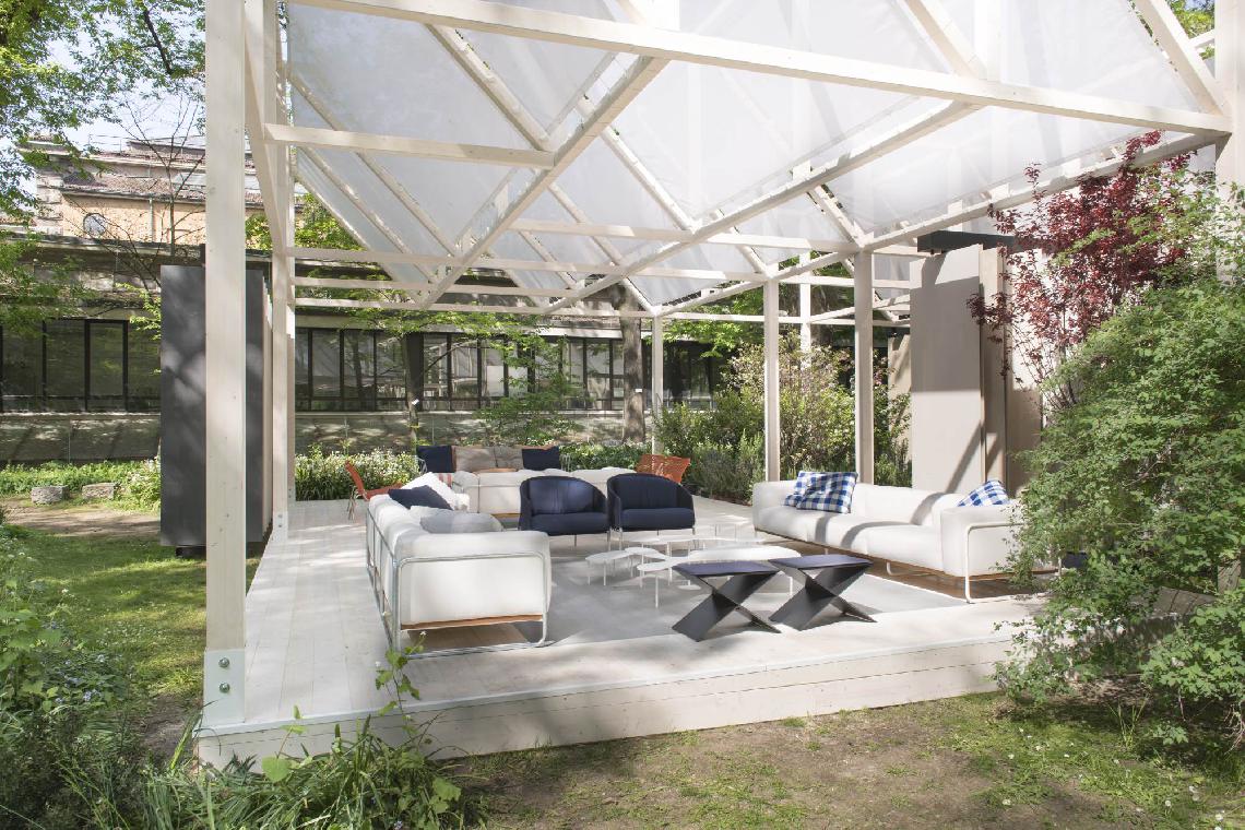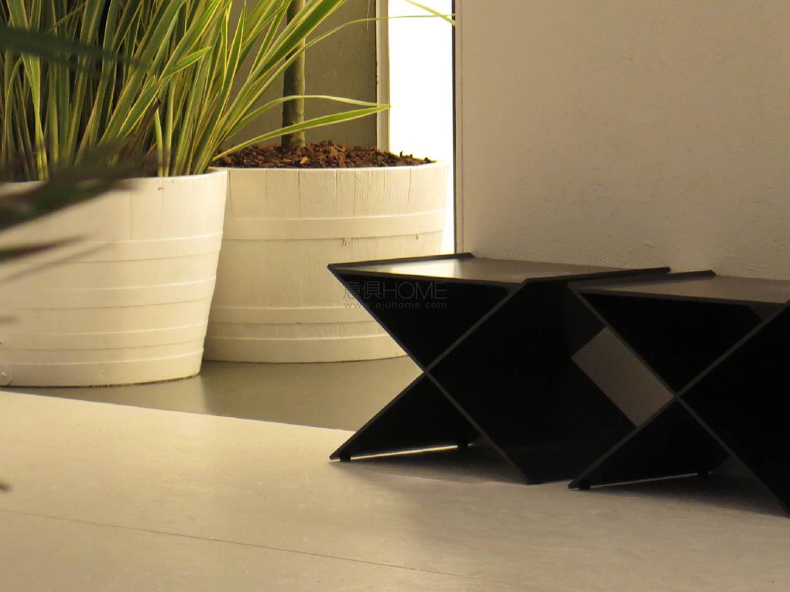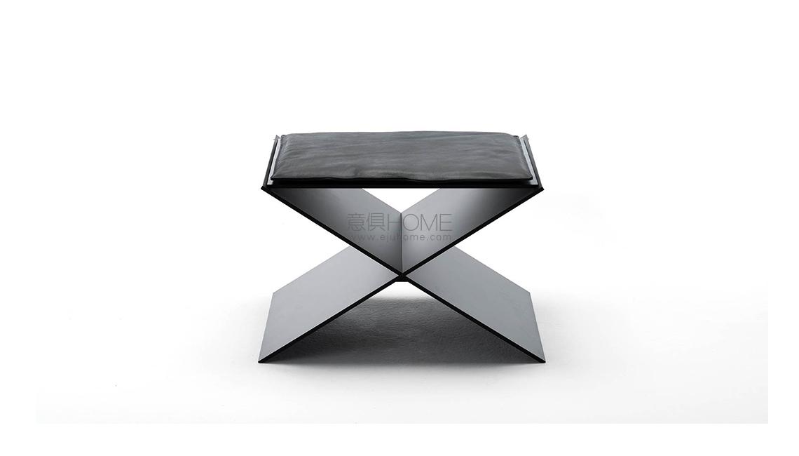 Stool available for indoor and outdoor with frame in 8mm thick aluminum plates with matt black epoxy powder coating RAL-K7 9017. Base consisting of two intersecting milled plates, stabilized by a joint screwed under the structure and top glued through grafts. Indoor cushion: padding in polyurethane foam with fabric or leather upholstery. Outdoor cushion: padding with open cell structure polyurethane foam DRYFEEL S with outdoor fabric upholstery only. Both versions are non-removable.