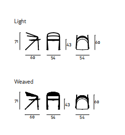 Dining chair available for indoor and outdoor in both Light version (only frame) and woven in the finishing available in our collection. Indoor: supporting frame in tubular and steel rod section ?16mm coated with epoxy powder finish RAL-K7 9017 matt black. Weave in natural wicker (? 3 mm) toasted and finished with a transparent varnish, profile in hide (? 2,5 mm) or waxed rope (? 2 mm). Seat, made of 5 slats glued together, in natural or charcoal- dyed solid ash wood with water-based acrylic paint finish. Outdoor: supporting frame in tubular and steel rod section ?16mm coated with a galvanizing base for outdoor and epoxy polyester powder finish RAL-K7 9017 matt black. Weave in waxed rope (? 2 mm) and seat, made of 5 slats glued together, in solid Iroko wood. Floor support secured by plastic feet.