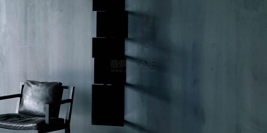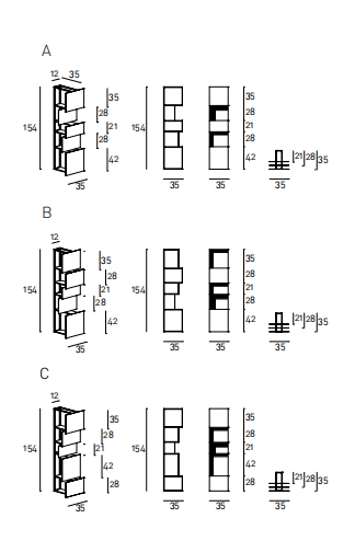 Bookcase made of vertical modules composed by 5 panels of different sizes and depth with supporting frame in square section tubular steel 12x12mm and frontal panel in 3mm steel plate. Vertical and horizontal covers in aluminum plate 10/10. Epoxy powder coating in RAL-K7 white 9010 or black 9017. Modules to be fixed directly on the wall using the supplied plate.