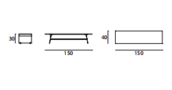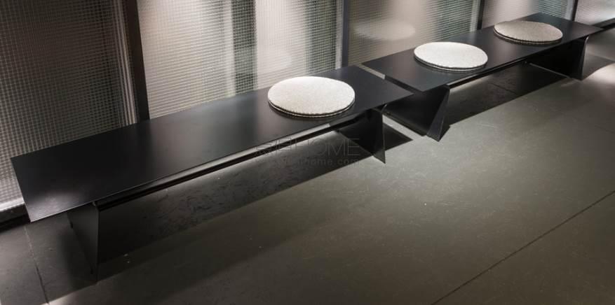 Bench consisting of three elements in 3mm sheet steel welded together, reinforced by two under-top 8mm structural element and by a steel bar that joins the two outer legs to provide rigidity to the whole structure. Ground support secured by plastic feet. Finishing with epoxy powder coating in black ANODIK.