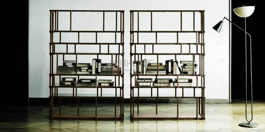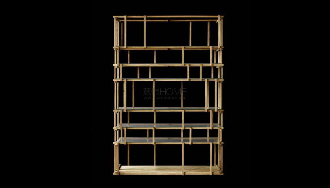 Bookshelf made of solid wood splints of various sizes, thickness 20x20mm assembled together. Finishes: natural oak, american walnut or walnut charcoal-dyed with water-based acrylic paint finish. 6 shelves in clear tempered glass 6mm thick. The base/lower shelf is always in wood, same finish as the bookshelf, with insert of a stabilizer weight.