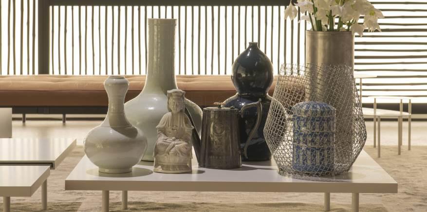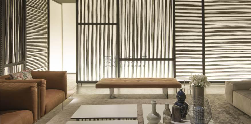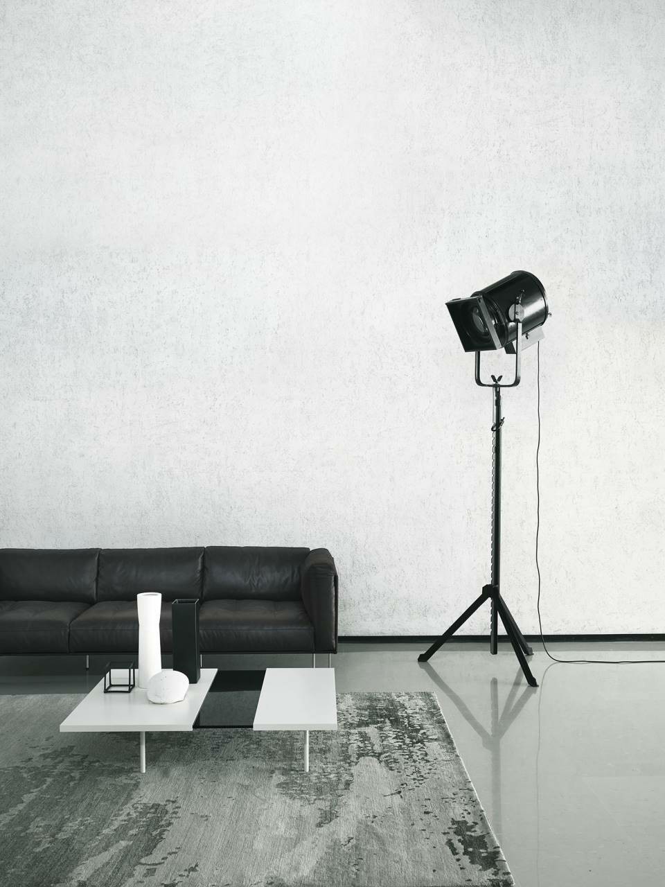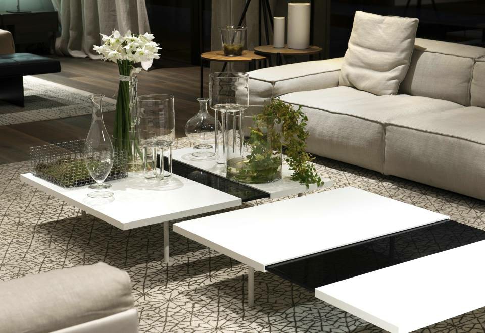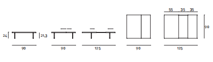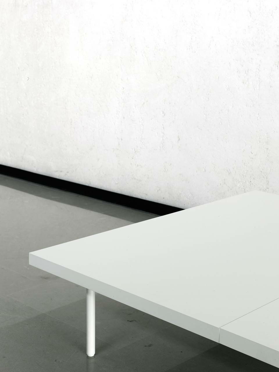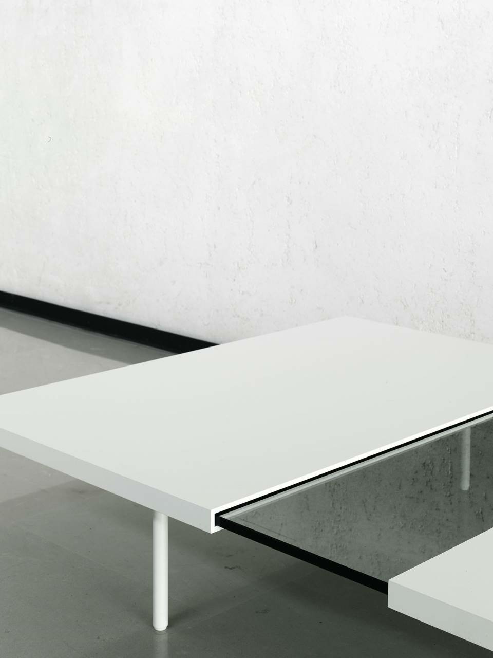 Extendable coffee table made of a supporting tempered glass top, 12mm thick, contained in two “shells” made in “folding” of aluminum honeycomb panels, pre-lacquered RAL-K7 9010 white or anodized. The lower part of the aluminum panel is milled to allow the inset of the legs, which are screwed to the glass top with a bushing. The shells are fitted with runners in a self-lubricating material, to allow them to slide.