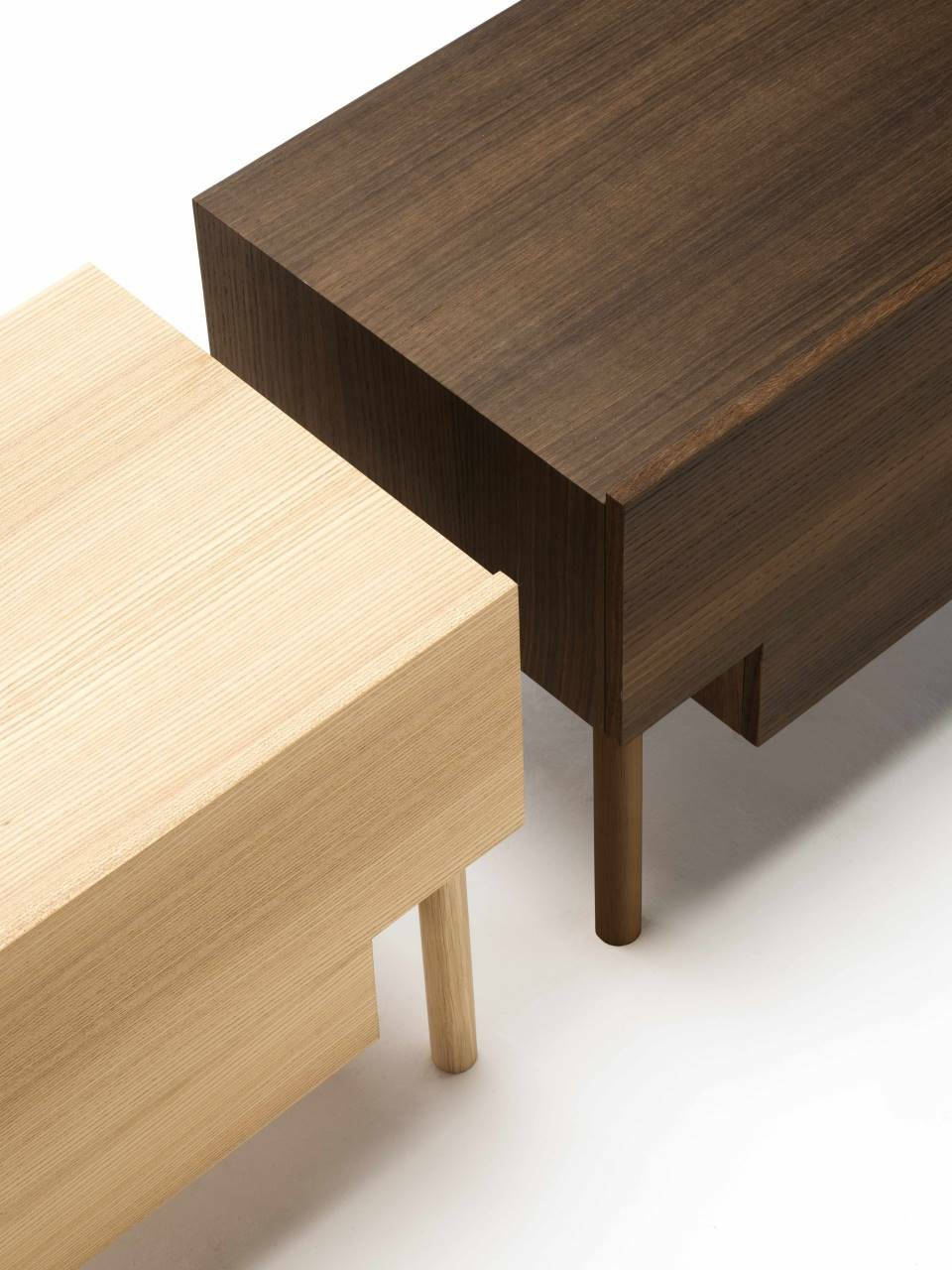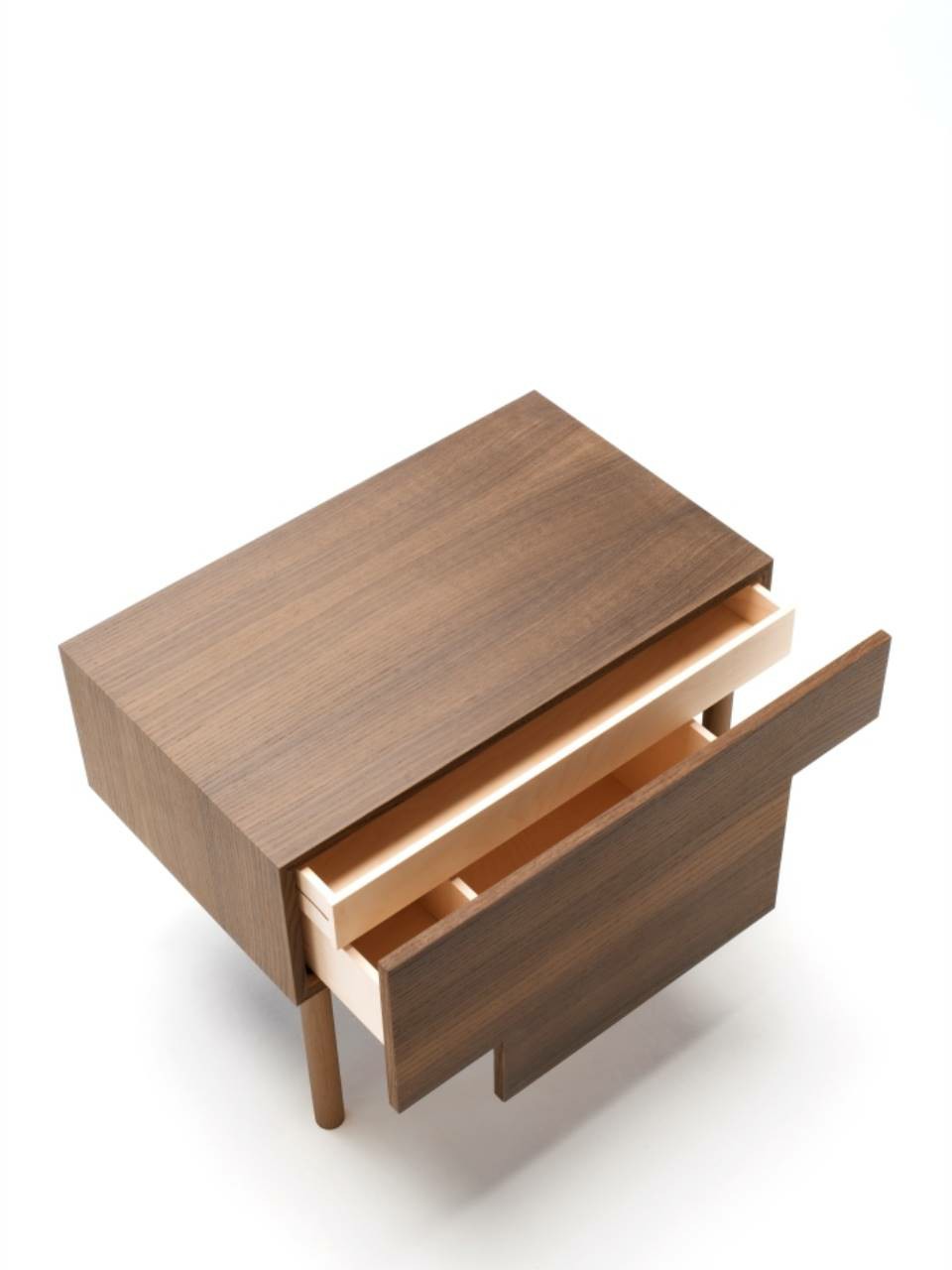 Bedside table with supporting frame in “folding” of MDF 15mm  thick veneered with elm or Thermo oak plates with water-based  acrylic paint finish. Legs in solid oak ?30mm, each with different  height: 15, 25 and 35cm. Front panel in 15mm thick MDF  veneered with elm or Thermo oak plates, with pull-out natural  birch drawer on Blum? runners, with two compartments of  different height and volumes, and one trinket drawer.  Available in right and left version.