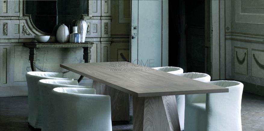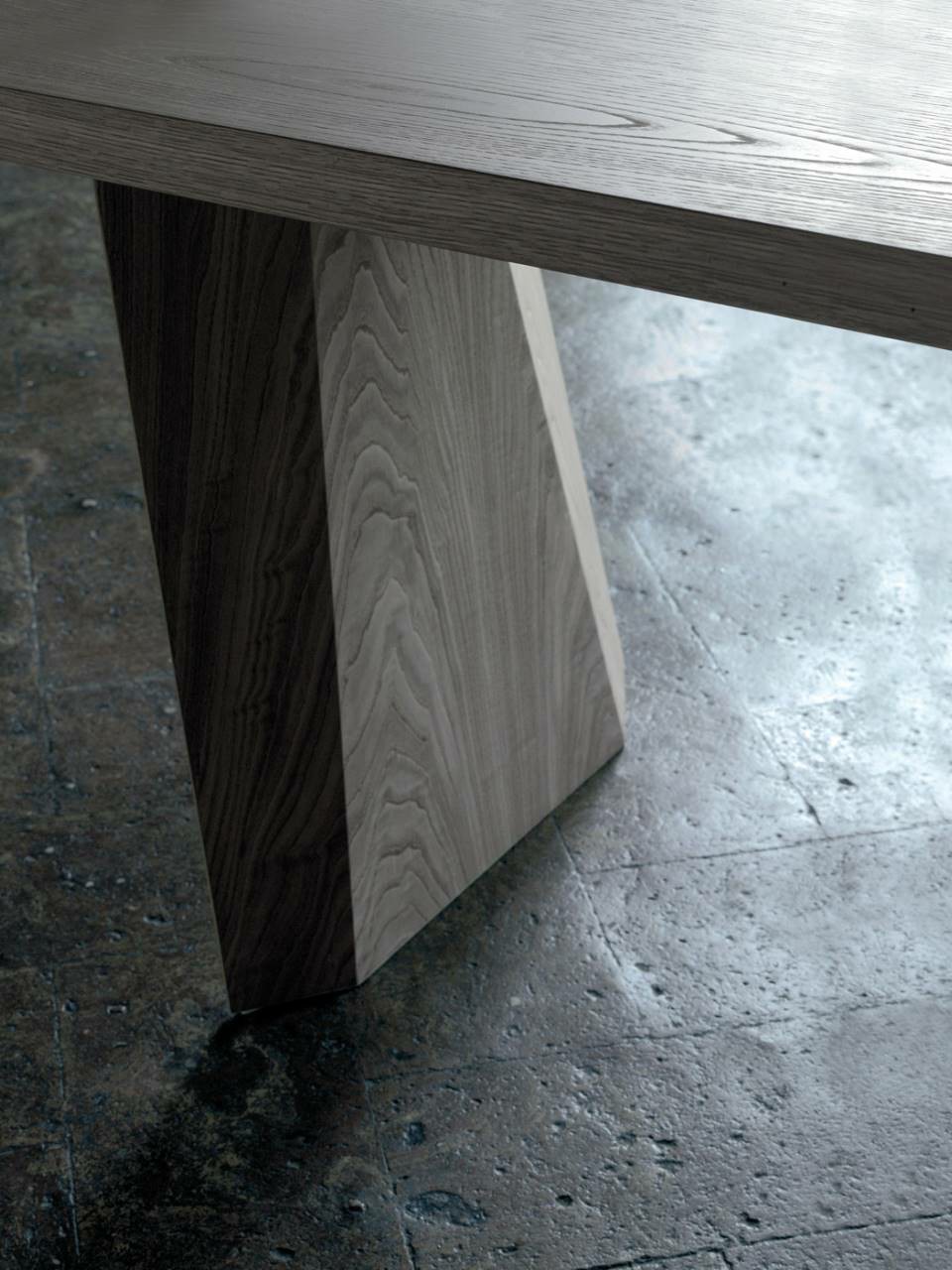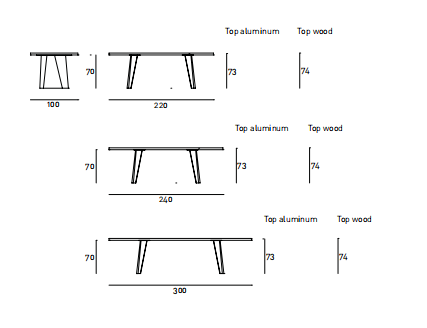 Rectangular dining table available for indoor or outdoor. Indoor version: wooden table consisting of a double-paneled top of 40mm, in balanced fir wood, reinforced by steel tubulars of 25x15mm, veneered with 10/10 plates and edged with solid wood of 4mm on the perimeter. Legs in multilayer birch veneered with 10/10 plates. Finishing in natural chestnut, charcoal dyed chestnut or Stone Oak? with water-based acrylic paint finish. Legs screwed to the top by steel plates finished with polyurethane lacquer. Indoor/outdoor version: aluminum table consisting of a top in 28mm alveolar aluminum completed with a 1mm aluminum-sheet with folding finishing and legs in 5mm alveolar aluminum panels with folding finishing. Primer for aluminum and outdoor polyurethane lacquer in RAL-K7 9010 white or 9017 black, or “concrete effect” finish col. Chiaro or col. Scuro. Legs screwed to the top by steel plates finished with outdoor polyurethane lacquer.
