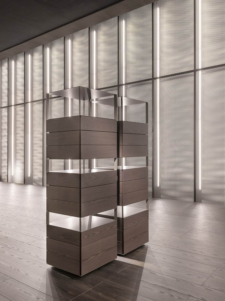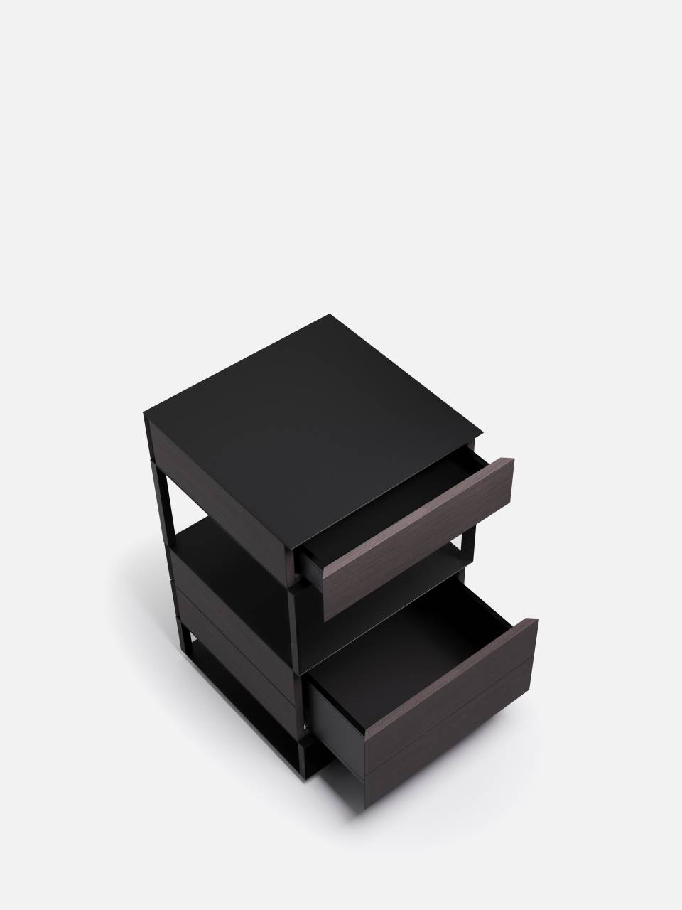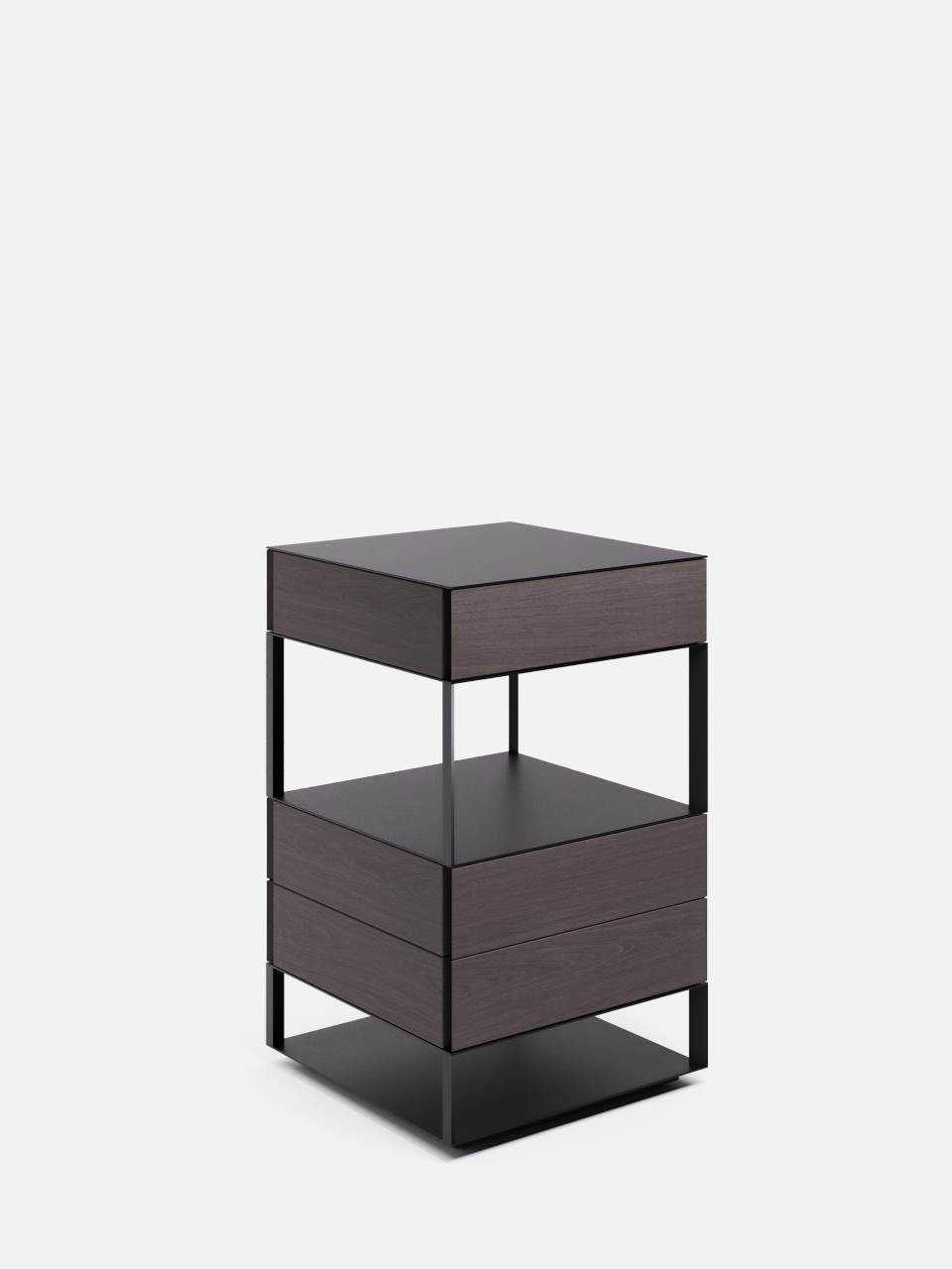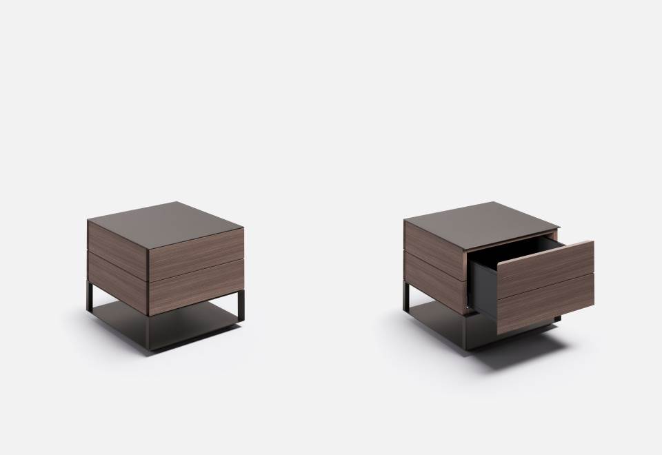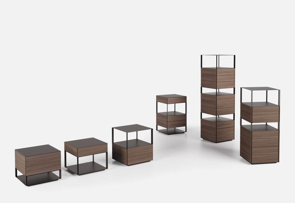A square base creates a structure that intersperses a landscape of solids and voids, culminating in a practical shelf together with intimate and discreet drawers, disguised by the outer surface.