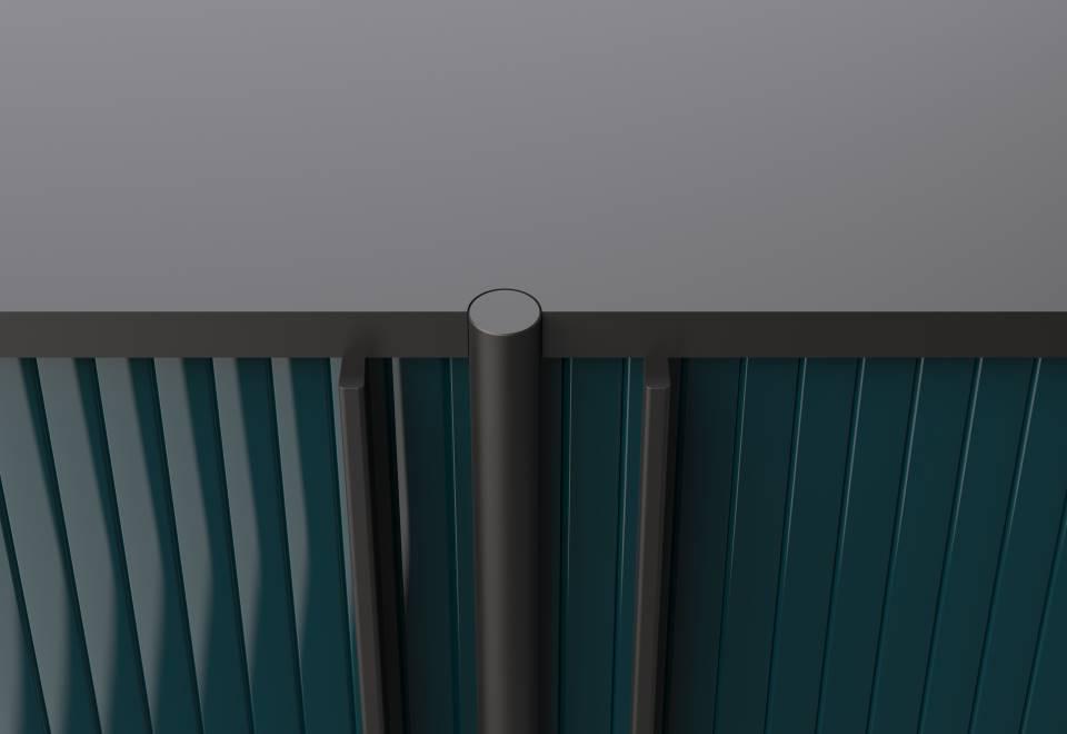 Bar unit composed of monoblock container consisting of top and bottom in 18 mm thick MDF fitted with a contoured runner to house a sliding shutter door made of extruded aluminium. Aluminum “blade -handles” section 10 x 8 mm thick, screwed to the shutter. Central body in contoured MDF milled on the outside, with internal side panels and central support shelf in MDF. Contoured lower shelf, in double- panelled wood, 18 mm thick, consisting of a 7 cm frame in solid beech wood and board honeycomb, enclosed by two aluminium plates, fitted with holes and bushings to allow assembly of the uprights. All MDF components are painted RAL-K7 9017 matt black. Shutter door with liquid painting RAL-K7 9017 matt black only. Uprights in steel rod ?22 mm, with inserted fixing element for the lower shelf. The frontal upright is provided with contoured plate for the fixing of the container compartment; while the other uprights are screwed to the backrest. Two additional steel rod supports, with integrated height adjustable PVC foot, are screwed to the lower shelf. Uprights, additional supports and feet are finished with epoxy powder coating in RAL-K7 9017 black. Available with internal spotlight equipped with motion sensor and rechargeable lithium battery. Charging with induction system and Micro USB cable. Available with 3000K light.