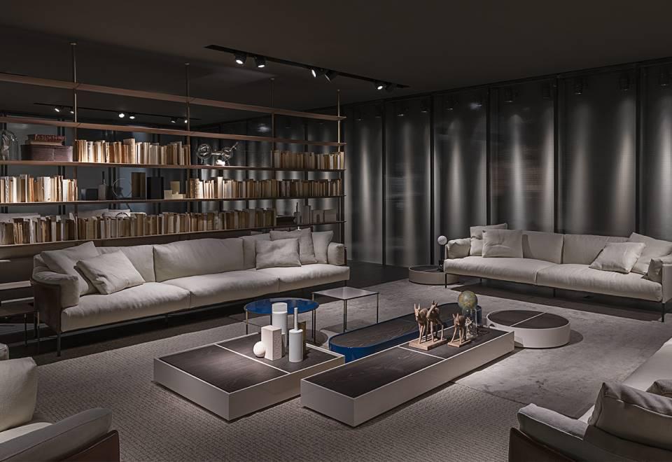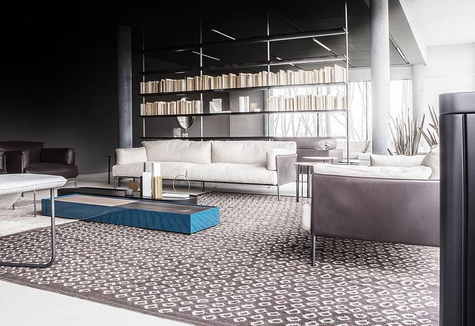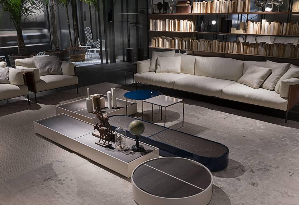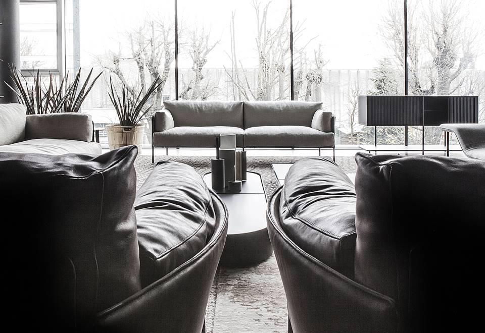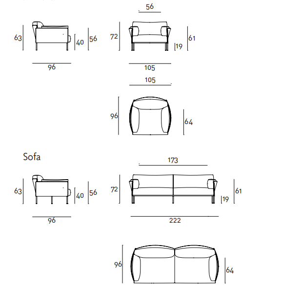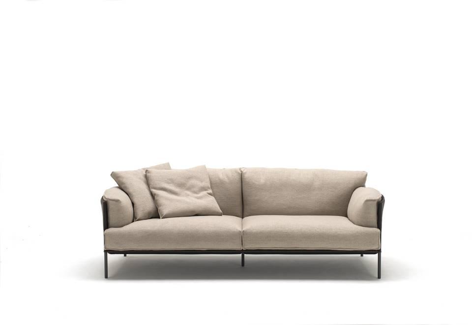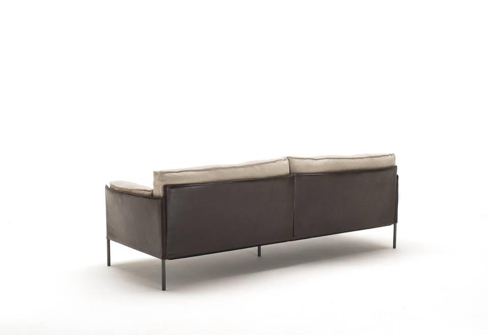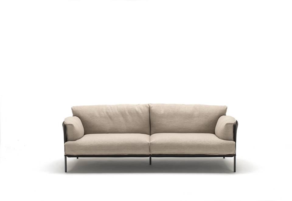 Sofa, available in fix measures 222/271/320cm, depth 96cm and armchair 105cm depth 96cm, with supporting structure in lacquered tubular steel, 60x30mm section, seat sprung with coated rubber elastic straps and polyurethane foam. Backrest and armrest structure in tubular steel embedded in cold- expanded polyurethane foam with covering in 100% polyether, thermally bonded onto a polyamide velveteen backing, screwed to the supporting structure. Seat, armrests and backrests cushions in prewashed and sterilized goose down, stitched into separate compartments, with performed polyurethane foam insert. Steel rod feet ?22mm, screwed to the backrest structure with a bushing, welded within the structure and seat cushions support bar, in ?20mm steel tube, fixed to the base by screw-spacer, with gunmetal grey epoxy powder coating. Floor support secured by adjustable black PVC feet. Cushions upholstery in fabric or leather, both fully removable by zippers and Velcro fastenings; backrest and armrest structure upholstery removable by Velcro fastenings for the fabric version only, while always fix when in Cuoietto or leather. Seat depth 64cm.