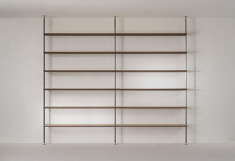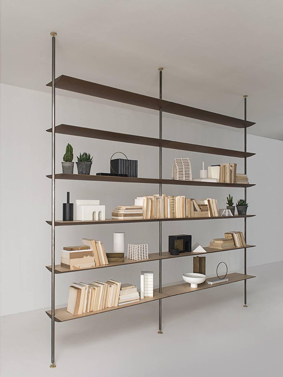 Bookcase inspired by the world of boating, which allows maximum freedom for floor-to-ceiling or wall mounted compositions. Steel uprights with hexagonal section 25 mm, fitted with holes having a center to center distance of 38,5cm (35cm of useful space) to install the shelves, and an additional wall fixing spacer, for greater structural rigidity (for the both versions). Uprights finishes: matt transparent liquid painted steel or brass coloured steel with matt transparent finish. Floor-to-ceiling support plates with joint, ?50 mm in satinized brass with a transparent matt varnish, screwed to the uprights. Floor, ceiling and wall support secured by black PVC elements. Maximum height of uprights: floor-to-ceiling version 305 cm; wallmounted version 250 cm with plate fitted for wall mounting (with a fisher) and wall support guaranteed by black PVC rounds. “Keel shaped” shelves (75/90/120/150 cm depth 33 cm) made of extruded aluminum bar, with glued an upper top in MDF (thickness 3mm) veneered in the finishings in collection and with terminal parts in solid wood, always in the same finishing of the “keel”, fitted with joints to allow the fixing to the uprights. Shelves available in the finishes: Stone Oak? veneered top with matt black painted “keel” part and terminal parts; top in bleached maple with “keel” and terminal parts in Canaletto walnut “rigatino”.