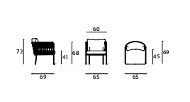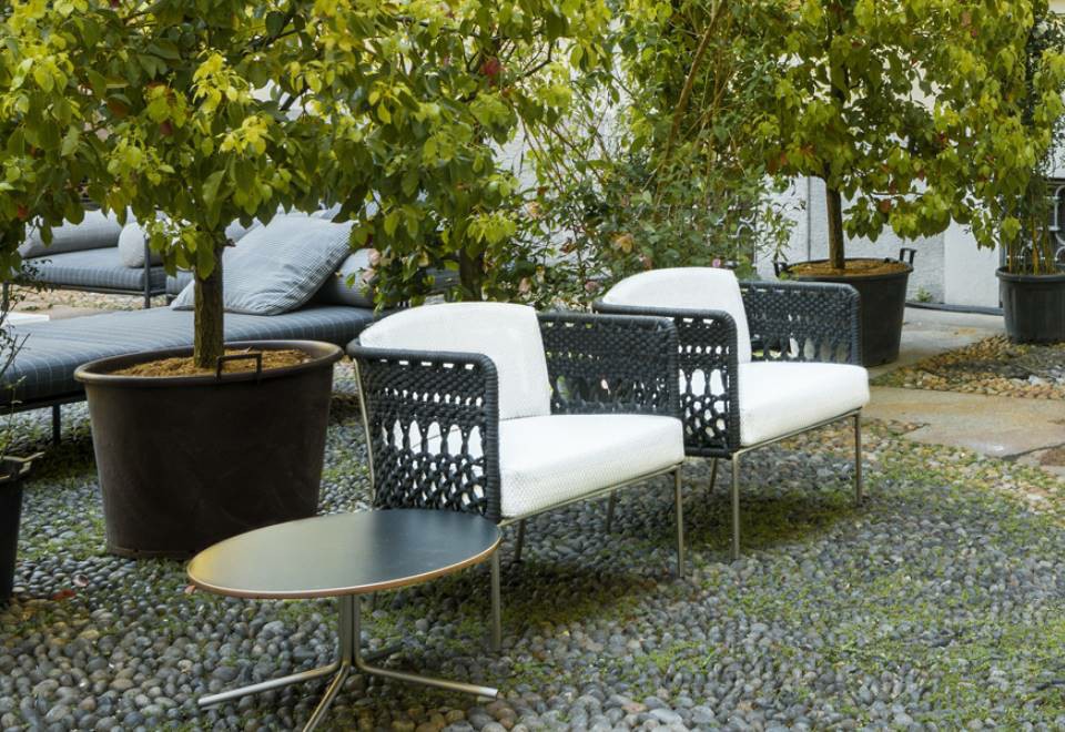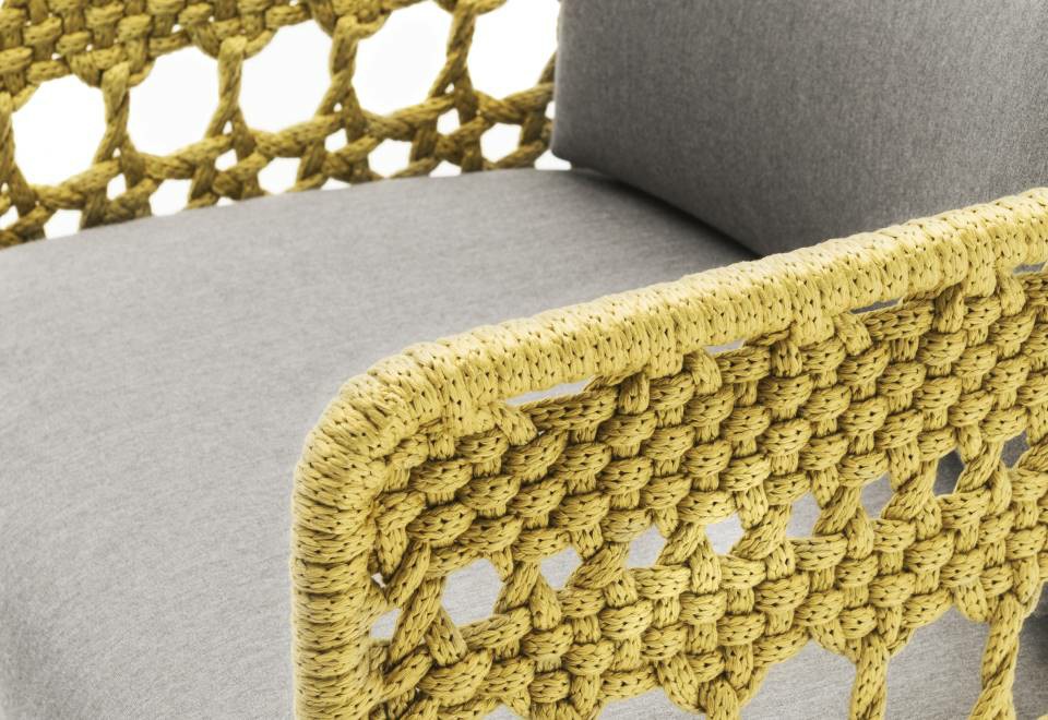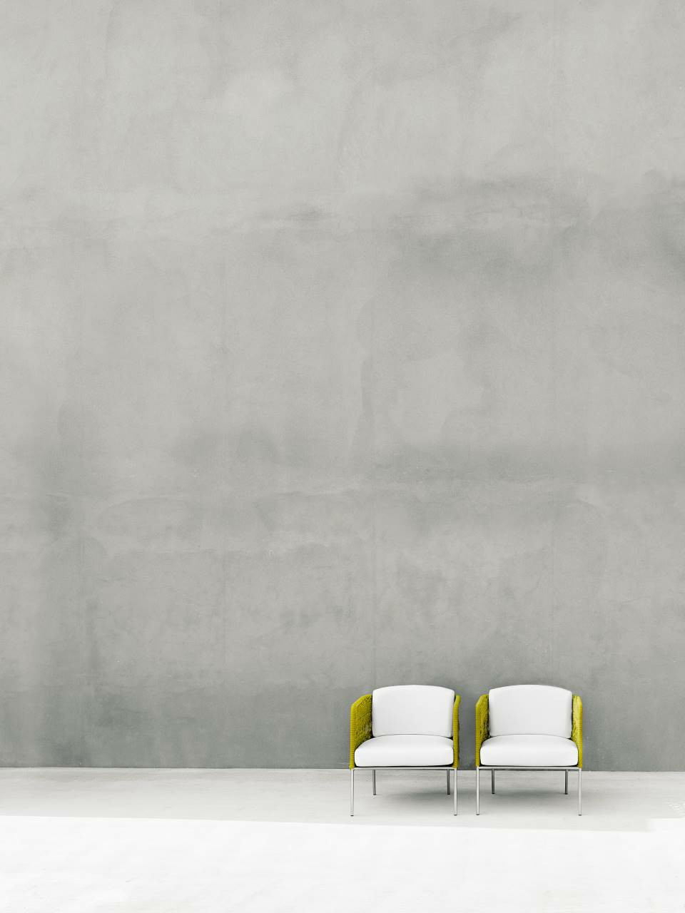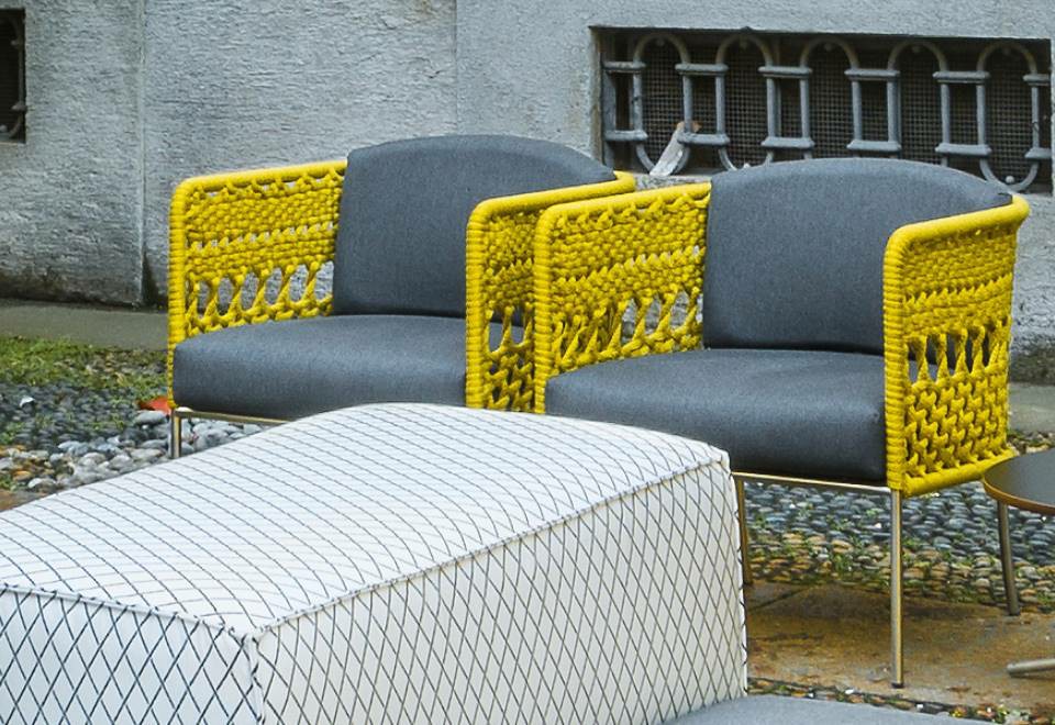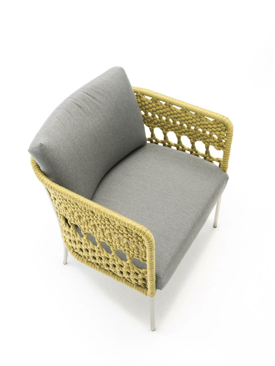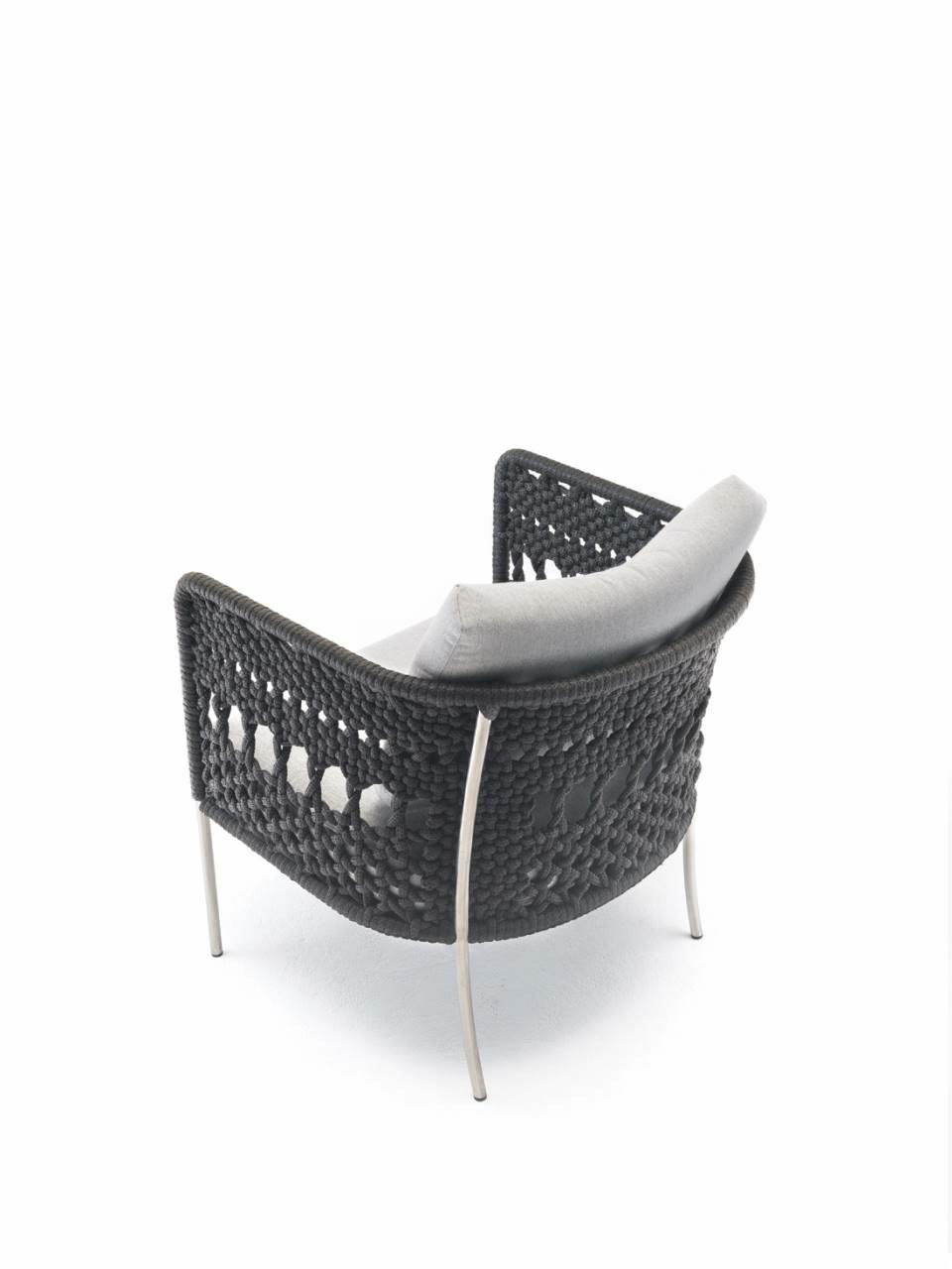 Armchair available for indoor and outdoor. Indoor version: tubular steel frame with chromed finish,  in AISI 316 stainless steel with matt-satin finish or with epoxy  powder coating gunmetal color. Seat chassis in self- supporting  decorative HPL plastic laminate panel. Seat cushion in polyurethane foam, covered with acrylic fibre  layers. Backrest cushion in polyurethane foam covered with  acrylic fiber layers. Fabric or leather upholstery, both fully removable by zippers. Outdoor version: tubular steel frame with chromed finish  or with a galvanizing base for outdoor with epoxy polyester  powder coating gunmetal color. Seat chassis in self- supporting  decorative HPL plastic laminate panel. Seat and backrest cushions in open cell polyurethane foam  and covered with acrylic fiber for outdoor. Upholstery with outdoor fabrics only, fully removable by zippers. Woven with a hypoallergenic, recyclable, eco- friendly tubular,  suitable both for indoor and outdoor, in colors in collection.  Inspired by the ancient crochet technique of Cantù, this lace  recaptures the traditional stitching called half stitch and linen  stich with joined twists, renewed in a contemporary manner  to create new patterns and designs through an extra-large  bobbin and decidedly thicker threads.
