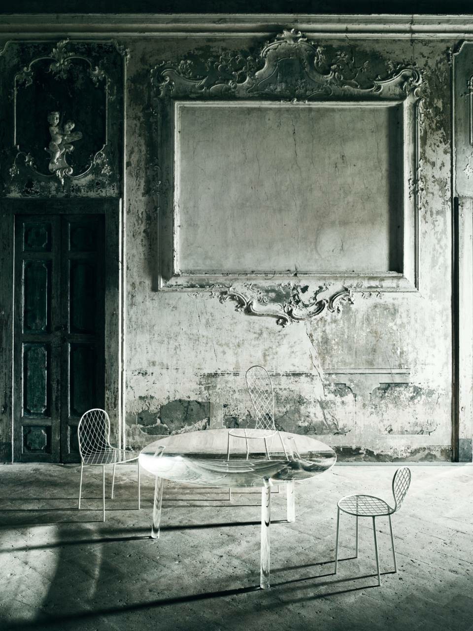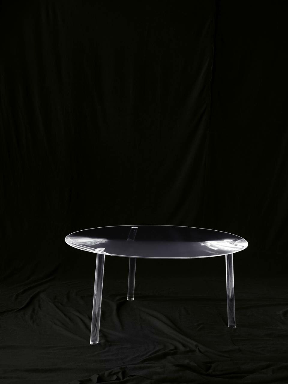 Table in plexiglass with top created from a large sheet of cast GS Plexiglas? (2000x3000mm, and 70mm thick) using a 5-axis numerical control machine. The process takes over 30 hours and involves two rough-hewing and three finishing operations, followed by a further two smoothing procedures and then three polishing procedures (using abrasive paste, polishing wax and finishing polish), all performed by hand, and requiring another 20 hours’ work. The holes for the insertion of the legs into the table top are made in the CNC machine by interpolation. The legs are made using 3 cast GS Plexiglas? cylinders, machine-processed to shape the part that slots into the table top, after which they are smoothed and polished by hand. The three resulting legs are all different, due to the different angles at which they are inserted and positioned. They are all perfectly and seamlessly integrated into the overall volume of the table. Drop Table is available in limited edition.