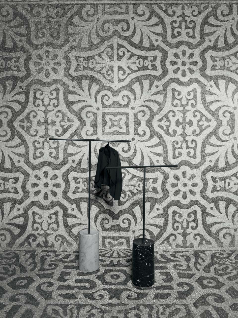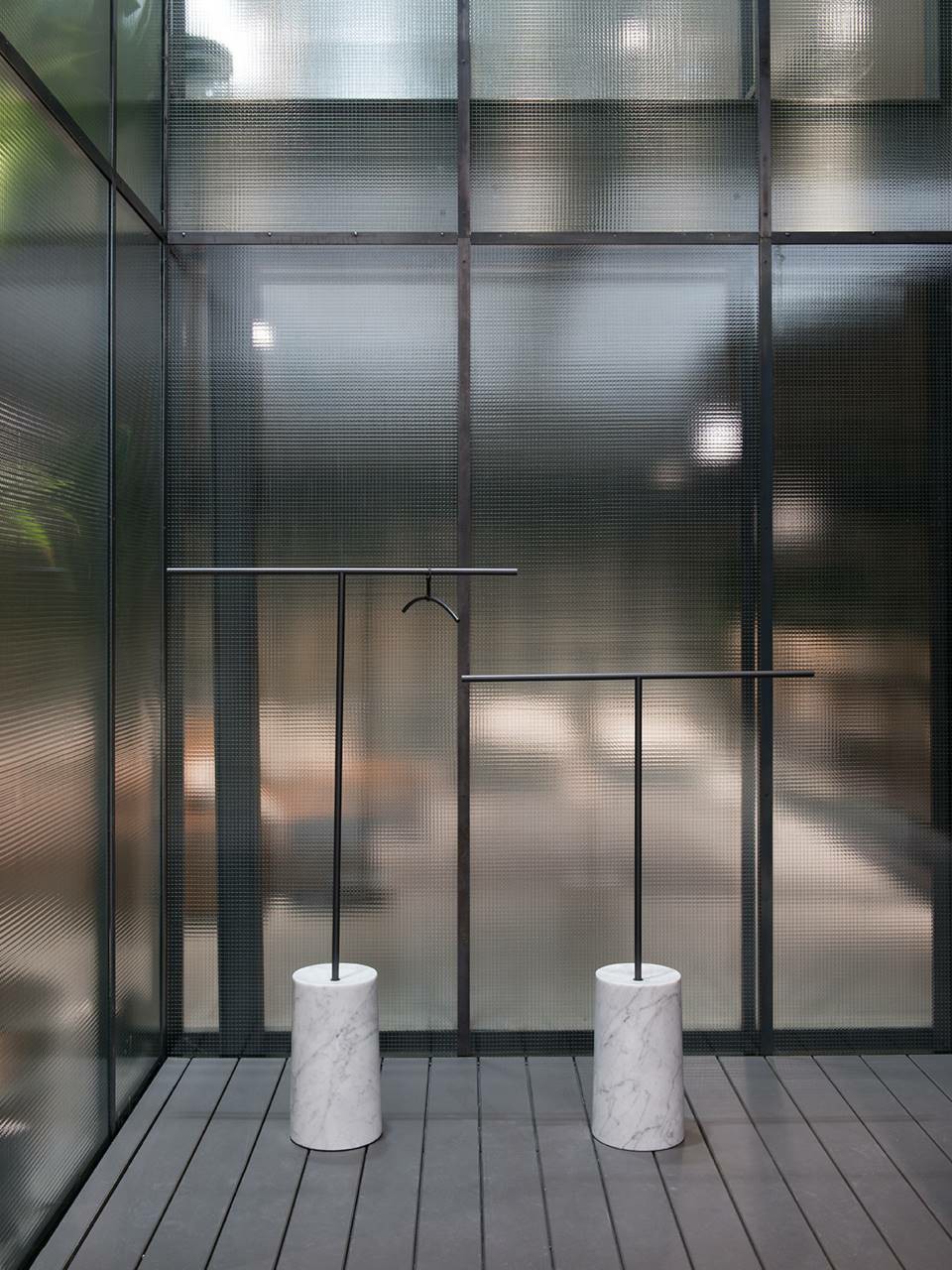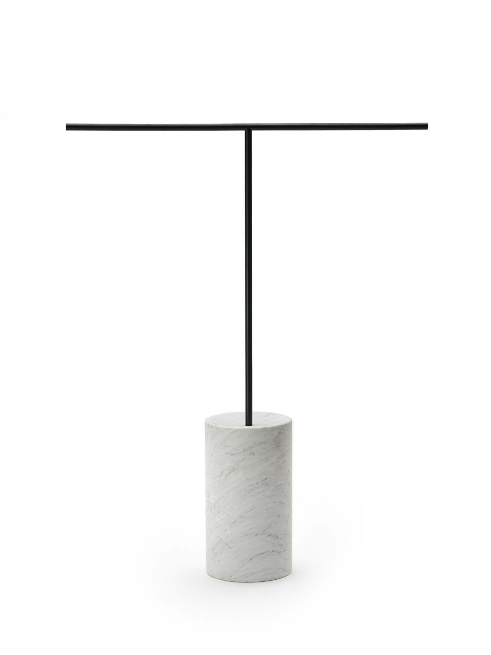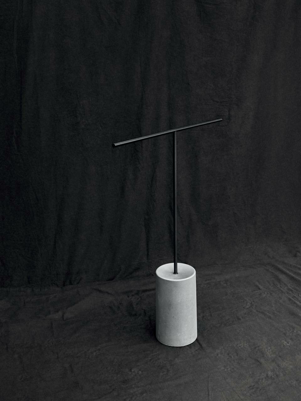 Coat-hanger, available in two heights, composed of a base carved  from a single block of black Marquina, white Carrara, red Levanto  marble with satin finish and opaque transparent protective varnish;  or in high-strength concrete finished with a hydro-repellent  protective treatment, with embedded a steel insert.  On request, the marble base is available also with polyester  glossy finish. Frame composed of two tubular steel ?20 mm elements, joined  together by means of screw, lacquered with epoxy powder coating  gunmetal grey colour, fixed to the base by a pierced sheet. Hangers consisting of a ?12 mm calendered steel rod and ?35 mm  steel ring lacquered with epoxy powder coating gunmetal  grey colour, connected together by a “band” of sewn black leather.
