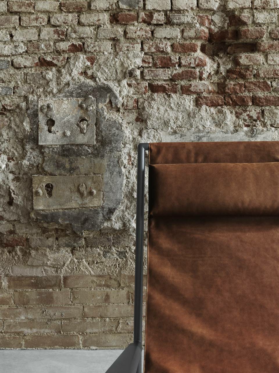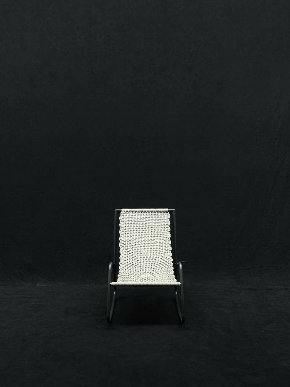 Rocking Chair available for indoor and outdoor. Indoor version: supporting frame in ? 25mm tubular steel coated with polyester epoxy powder gunmetal grey colour and black PVC runners. Non-removable upholstery, hooked to the frame through technical parts coupled to it, available in fabric or leather sewn together with a supporting material. Headrest in polyurethane foam covered with acrylic fiber layers, integrated into the upholstery. Small armrest in stainless stell AISI 316, secured to the frame with stainless stell screws, coupled with non-removable black hide or coated with polyester epoxy powder gunmetal grey colour. Outdoor version: supporting frame in ? 25mm tubular Stainless steel AISI 316 coated with polyester epoxy powder gunmetal grey colour and black PVC runners. Non-removable upholstery hooked to the frame through technical parts coupled to it, available in the outdoor fabrics only, sewn together with a supporting material. Headrest padded with DRYFEEL S and outdoor fiber layers, integrated into the upholstery. Small armrests in Stainless steel, secured to the frame with Stainless steel screws, coated with polyester epoxy powder gunmetal grey colour. For both versions, upholstery available woven (Readymade UNpizzo), with a non-removable an hypoallergenic, recyclable, eco-friendly tubular, suitable both for indoor and outdoor, in the colours in collection. For the woven version only, additional headrest, not integrated into the upholstery, in polyurethane foam covered with acrylic fiber layers for the indoor version and, padded with DRYFEEL S and outdoor fiber layers, for the outdoor version.