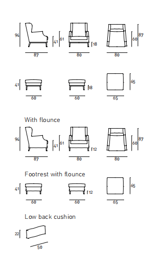 Bergère armchair with frame in poplar and pine plywood. Support in cross-woven, coated rubber elastic straps. Frame padding in differentiated density polyurethane foam. Covering in needle punched, resinated, non-woven polyester fibre, bonded onto a polyamide velveteen backing. Seat cushion in prewashed and sterilized goose down, stitched into separate compartments with insert in polyurethane foam. Base in solid oak wood with acrylic painting, natural polished or charcoal dyed. Fabric or leather upholstery. The fabric version only is also available with flounce 12cm from the floor and is fully removable by zippers and Velcro fastenings. The leather version is always without flounce and non-removable upholstery. Seat depth 60cm.