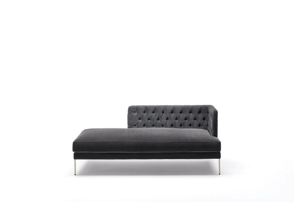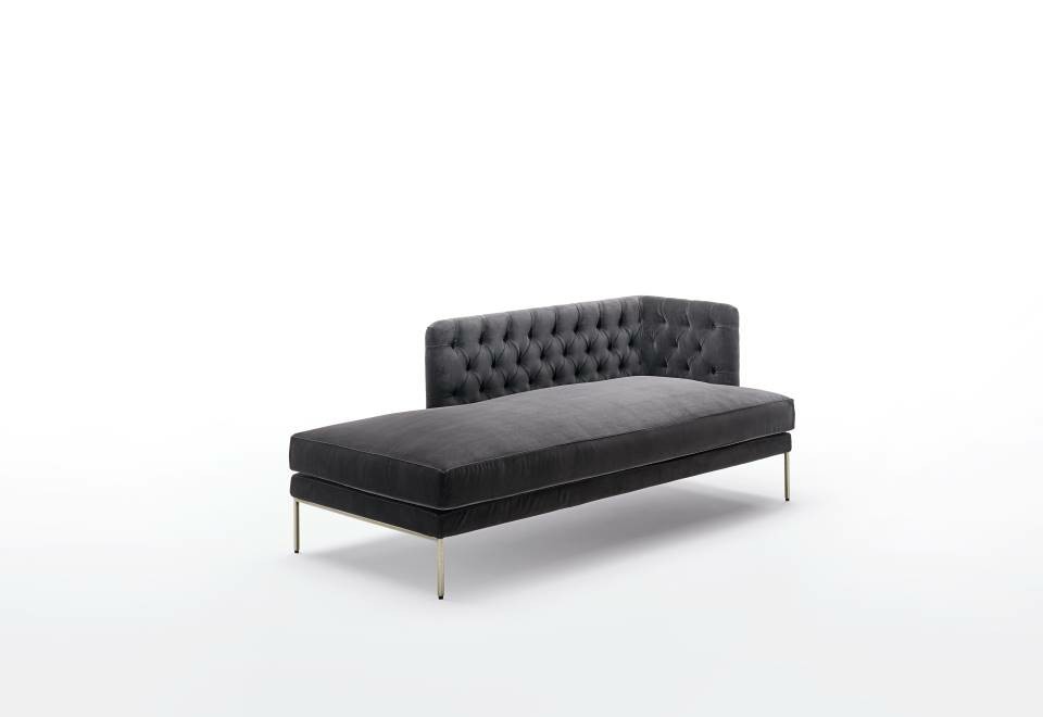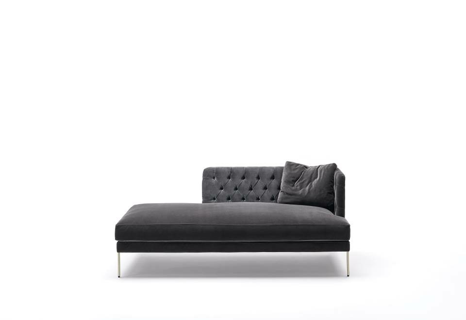 Dormeuse with armrest and backrest frame in multilayer poplar wood and padding, with “capitonné” working, in differentiated density polyurethane foam with acrylic fibre layers. Seat chassis in 50x30mm tubular steel with black epoxy powder coating, sprung with coated rubber elastic straps and padded in polyurethane foam covered in 100% polyether thermally bonded onto a polyamide velveteen backing. Seat cushions in differentiated density polyurethane foam and Visco-soft covered with acrylic fibre layers. Tubular steel feet, joined by a bracket in square section 15x15mm, with epoxy powder coating burnished color with adjustable black PVC tips. Armrest and backrest upholstery, with capitonné working, non-removable in both leather or fabric version; seat cushion upholstery in fabric or leather, both fully removable by zippers.