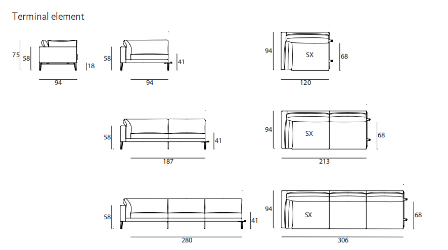 Modular sofa with backrest and armrests structure in multilayer poplar wood and double-panelled fir-wood, padded in differentiated density polyurethane foam, and covering in needle punched, resinated, non-woven polyester fiber, bonded onto a polyamide velveeten backing. Steel seat chassis, with epoxy powder coating, sprung with coated rubber elastic straps, padded in polyurethane foam. Backrest and armrest cushion in prewashed and sterilized goose down, stitched into separate compartments, with polyurethane foam insert. Seat cushion in differentiated density polyurethane foam and Visco-soft insert, covered with acrylic fibre layers. Foot made of laser-cut steel sheet with epoxy powder coating gunmetal grey color. Floor support secured by black PVC feet. Fabric or leather upholstery, both fully removable by zippers and Velcro fastenings. Seat depth: 68 – 134cm.