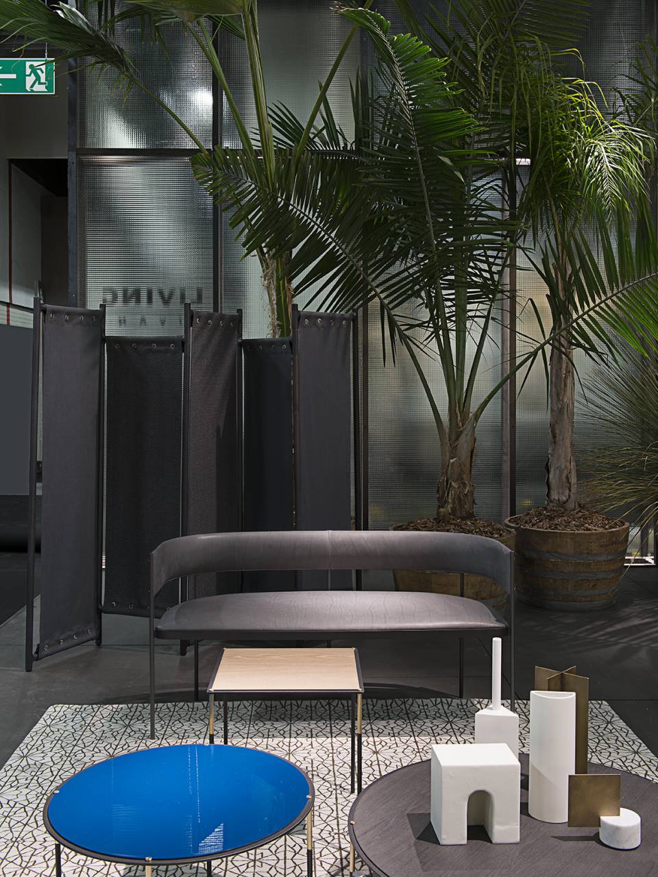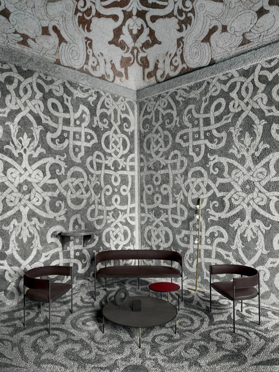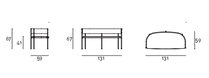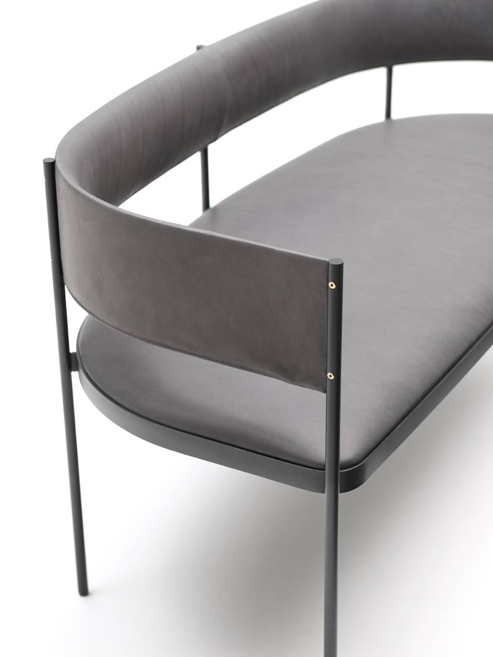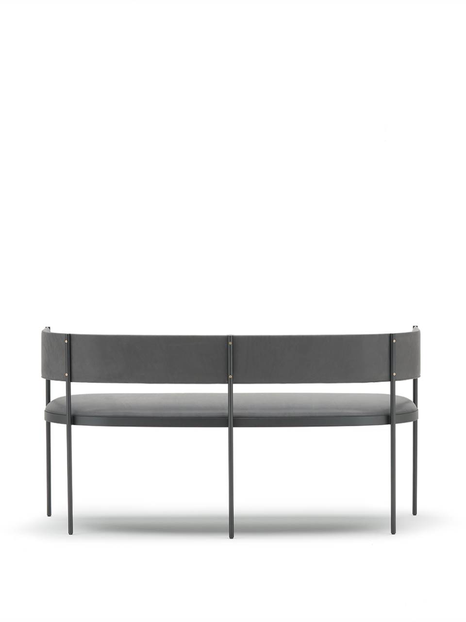 Settee consisting of ?16 mm steel rod legs, tied together through a contoured sheet-steel ring 4 mm thick, laser cut in one piece, to which is welded a drawn and calendred steel plate section 30x4 mm, which serves as seat chassis. Seat panel in multilayer poplar wood, sprung with coated rubber elastic straps, and padding in polyurethane foam covered with acrylic fibre layers. Backrest consisting of a calendred sheet-steel band 1,5 mm thick, padded with polyurethane foam, inserted to the legs through a mill in the front part, and secured to the legs through brass screws, made on specific design. All steel part, aside from the screws in brass with matt lacquered finish, are coated with epoxy powder coating gunmetal grey colour. Non-removable fabric or leather upholstery. Floor support secured by black PVC feet.