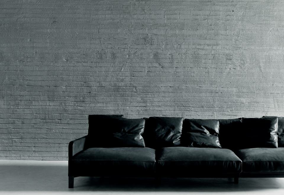 Sofa with backrest frame in double-paneled fir-wood and armrest and seat frame in multilayer poplar wood, padded in polyurethane foam covered with acrylic fiber layers. On the front part of the seat frame is fixed a 3mm steel sheet, coated and shaped according to specific design, covered with acrylic fiber layers. Seat chassis, inserted into the base, in 40x30mm tubular steel, with epoxy powder coating, sprung with coated rubber elastic straps; padding in polyurethane foam covered in 100% polyether thermally bonded onto a polyamide velveteen backing. Seat cushions in differentiated density polyurethane foam and Visco-soft, covered with prewashed and sterilized goose down, stitched into separate compartments and covering in needle punched, resinated, non -woven polyester fiber, bonded onto a polyamide velveteen backing. Backrest cushion in prewashed and sterilized goose down, stitched into separate compartments, with polyurethane foam insert. Fabric upholstery fully removable by zippers and Velcro fastenings. Fix leather upholstery for structure only. Tubular steel feet ?30mm, joined by a bracket, with bronzed epoxy powder coating or feet in solid wood veneered Stone Oak?, screwed to a tubular steel bracket, rectangular section 25x15 mm, painted with matt black epoxy powder; both versions with black PVC tips.