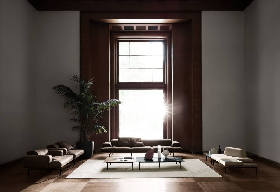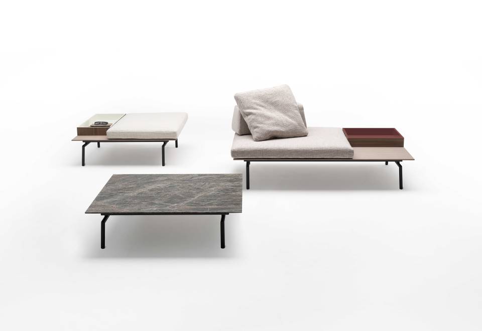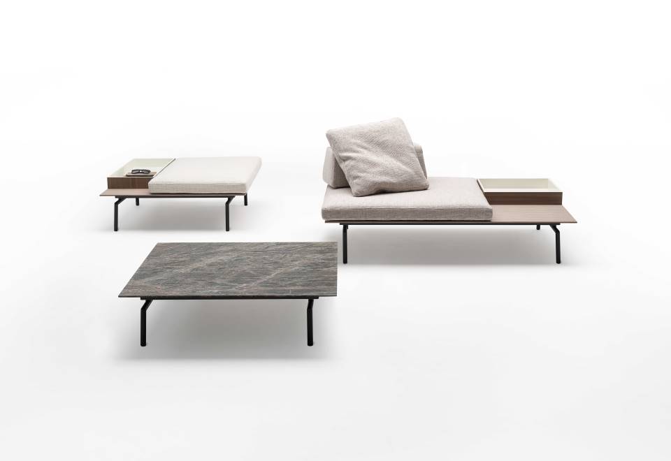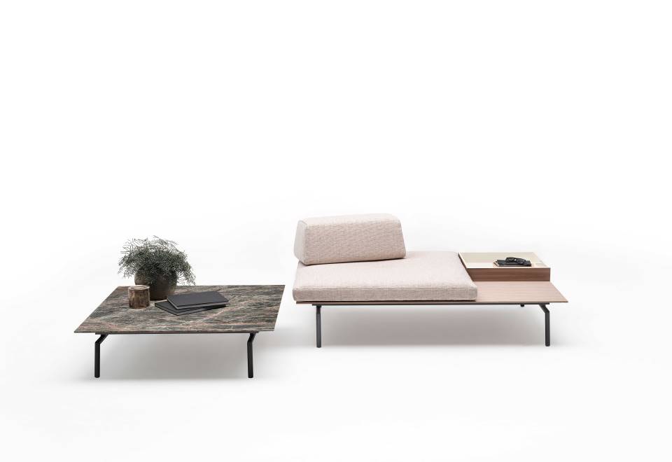 The Sumo bench features loose cushions of different sizes that are combined with the wood top to which elegant and functional colored containers can be paired.