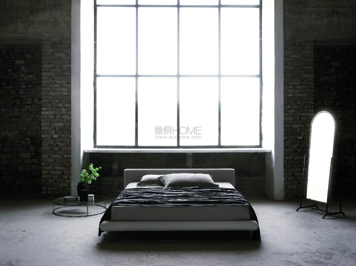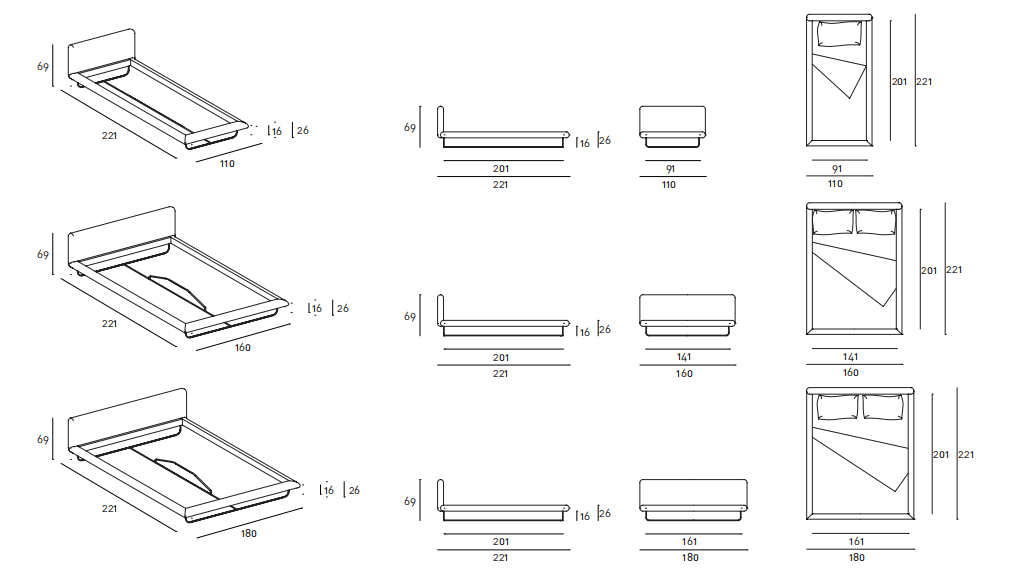 Single or double bed with headboard and bedstead structure in double-panelled poplar and pine padded in differentiated density polyurethane foam. Covering in needle punched, resinated, nonwoven polyester fibre, bonded onto a polyamide velveteen backing. Base in AISI 304 stainless steel tube, with matt satin-finish. Black lacquered metal frame for bed assembly and slat base support. Fabric or leather upholstery, both fully removable by Velcro fastenings. Fabric cover to protect the slat base, in 100% cotton, col. Ecru, fixed to the bedstead upholstery by zippers to open it on the sides and allow to inset the slat base. Available also in American Queen and King size.
