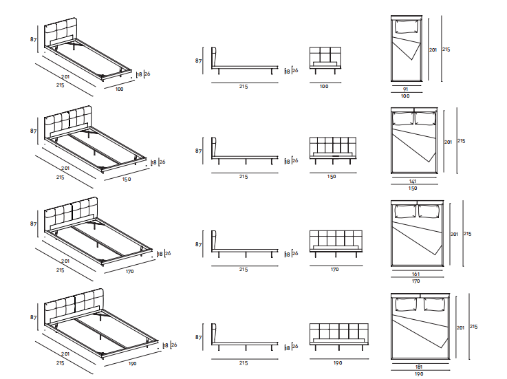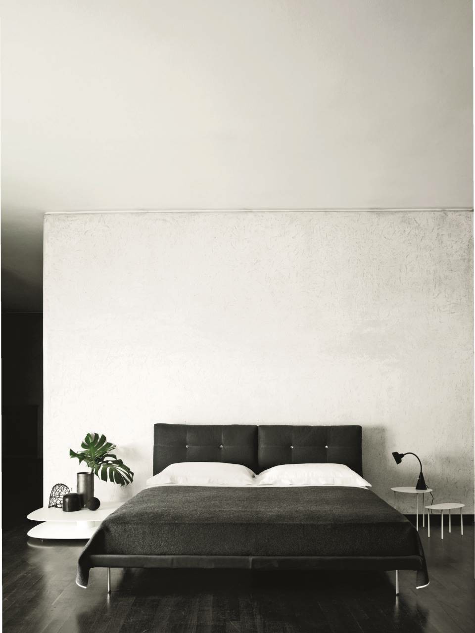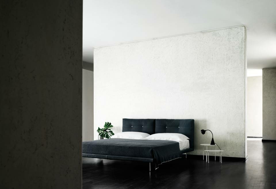 Single or double bed with HPL headboard panel. Prewashed and sterilized goose down cushions with polyurethane foam insert and a poplar plywood panel to fix them to the frame by plug-in hinges. The cushions are quilted with buttons at sight or, on request, quilted without buttons. Bedstead structure in steel with black epoxy powder coating padded in differentiated density polyurethane foam. Covering in 100% polyether thermally bonded onto a polyamide velveteen backing. Stainless steel feet, polished or matt satin-finish, screwed to the base with a bushing. Fabric or leather upholstery, both fully removable by Velcro fastenings. Fabric cover to protect the slat base, in 100% cotton, col. Ecru, fixed to the bedstead upholstery by zippers to open it on the sides and allow to inset the slat base. Available also in American Queen and King size.