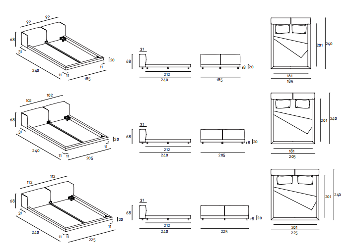 Bed with headboard and bedstead structure in double-paneled poplar and pine, bedstead padded in differentiated density polyurethane foam and headboard padded in differentiated density polyurethane foam covered with a mat in prewashed and sterilized goose down, stitched into separate compartments or covered with acrylic fibre layers. Covering in needle punched, resinated, nonwoven polyester fibre, bonded onto a polyamide velveteen backing. Anodized black aluminum feet. Fabric or leather upholstery, both fully removable by Velcro fastenings. Fabric cover to protect the slat base, in 100% cotton, col. Ecru, fixed to the bedstead upholstery by zippers to open it on the sides and allow to inset the slat base.