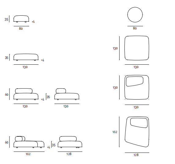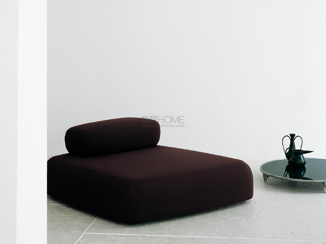 Elements with different shapes and sizes, available for indoor and outdoor. Indoor: one-piece frame in double-panelled poplar and pine. Sprung base with cross-woven coated rubber elastic straps. Padding in differentiated density polyurethane foam. Covering in needle punched, resinated, non-woven polyester fibre, bonded onto a polyamide velveteen backing. Fabric or leather upholstery. Outdoor: one-piece frame in marine plywood. Sprung base with cross-woven coated rubber elastic straps. Padding with open cell structure polyurethane foam FILTREN?T, covered with fibre for outdoor and a waterproof fabric. Upholstery with outdoor fabrics only. Both versions with black adjustable PVC feet and fabric upholstery only fully removable by zippers and Velcro fastenings.