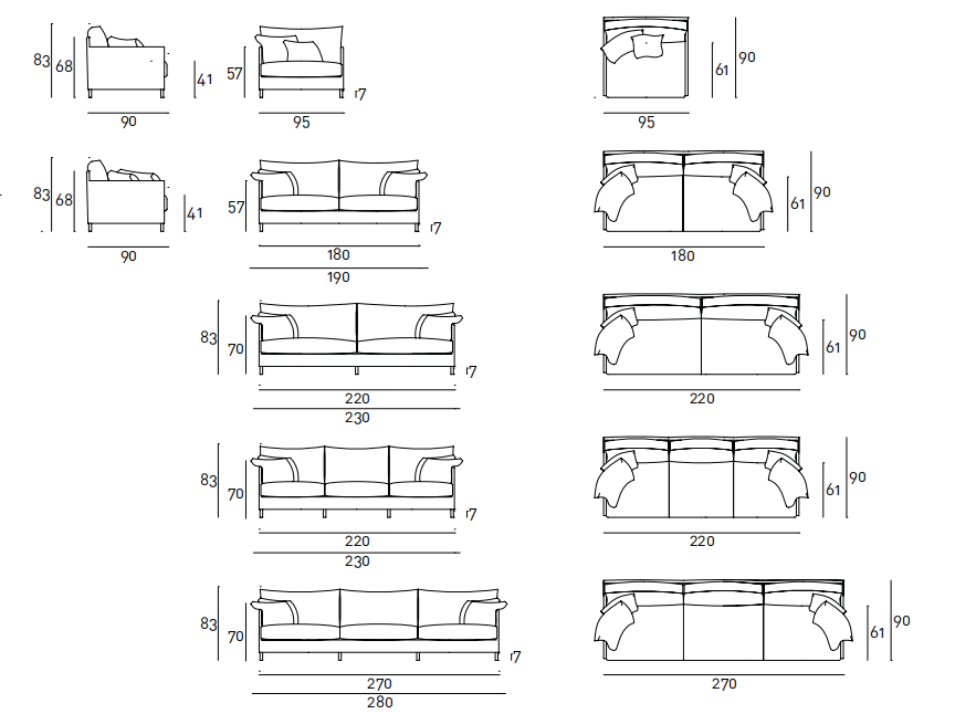 Fix or modular sofa and armchair. Supporting frame in lacquered  drawn tubular steel. Seat chassis in fir wood, with cross-woven,  coated rubber elastic straps. Backrest and armrest frames  made with a structural elastic material. Covering in 100%  polyether thermally bonded onto a polyamide velveteen backing.  Seat and backrest cushions padding with polyurethane foam insert  coated with prewashed and sterilized goose down, stitched into  separate compartments, or covered with acrylic fibre layers.  Armrest cushions and supporting pillows in prewashed and  sterilized goose down, stitched into separate compartments.  Tubular feet in AISI 304 stainless steel with matt satin-finish,  on request available in natural or ebony-dyed oak. Fabric or leather  upholstery, both fully removable by zippers and Velcro fastenings.  Standard flounce 7cm from the floor for fabric upholstery only,  on request available also without flounce.  The leather version is always without flounce. Seat depth 61-81cm.