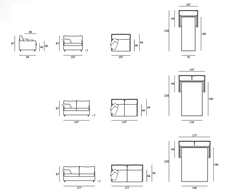 Sofa bed with structure in poplar plywood. Covering in 100% polyether thermally bonded onto a polyamide velveteen backing. Seat cushion with preformed, differentiated density polyurethane foam structure, coated with acrylic fibre layers. Back cushions in prewashed and sterilized goose down, stitched into separate compartments with insert in polyurethane foam. Black PVC feet. Fabric or leather upholstery, both fully removable by zippers and Velcro fastenings. Fabric upholstery only, with flounce 4cm from the floor. The leather version is always without flounce. Electro-welded orthopedic base, high tensile steel frame with epoxy powder coating finish. Steel spring mattress with 100% cotton cover. Cover in fabric, to protect the base. Seat depth 68cm.
