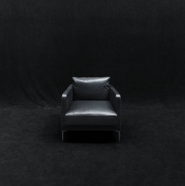 Armchair with backrest frame in double-paneled fir-wood and armrest and seat frame in multilayer poplar wood, padded in polyurethane foam covered with acrylic fiber layers. Seat chassis, inset in the base frame, in solid fir-wood sprung with coated rubber elastic straps; padding in polyurethane foam covered in 100% polyether thermally bonded onto a polyamide velveteen backing. Seat cushions in prewashed and sterilized goose down, stitched into separate compartments, with differentiated density polyurethane foam and Visco-soft insert, and covering in needle punched, resinated, non -woven polyester fiber, bonded onto a polyamide velveteen backing. Backrest cushion in prewashed and sterilized goose down, stitched into separate compartments, with polyurethane foam insert. Fabric upholstery fully removable by zippers and Velcro fastenings. Fix leather upholstery for structure only. Tubular steel feet ?30mm for armchair and ?22mm for easy chair, joined by a bracket, with bronzed epoxy powder coating and black PVC tips, or feet in solid wood footprint 50x50mm section for armchair and 40x40mm for easy chair, veneered Stone Oak?, screwed to a tubular steel bracket, painted with matt black epoxy powder. Seat depth 61cm for armchair and 50cm for easy chair.