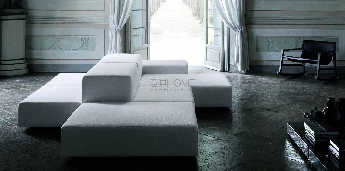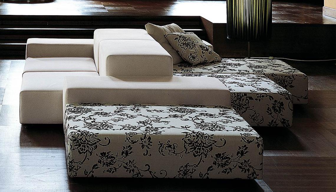 Modular elements of different dimensions, available for indoor and outdoor. Indoor version: frame in double-paneled poplar and pine. Support in cross-woven, coated rubber elastic straps. Padding in differentiated density polyurethane foam. Covering in needle punched, resinated, non-woven polyester fibre, bonded onto a polyamide velveteen backing. Fabric or leather upholstery. The fabric version only is fully removable by Velcro fastenings. All elements in leather have perimeter seams, and the upholstery is non-removable. Outdoor version: frame in steel lacquered for outdoor for bases and in steel lacquered for outdoor and plywood for outdoor for backrests and armrests. For bases only, support in cross-woven, coated rubber elastic straps and hooks in Stainless Steel for outdoor. Padding with open cell structure polyurethane foam DRYFEEL S, coated with draining fabric for outdoor. Upholstery with outdoor fabrics only completely removable by Velcro fastenings. Both versions with black adjustable PVC feet; the various elements are joined together by means of hooks. Seat depth 68-94-120-134cm.